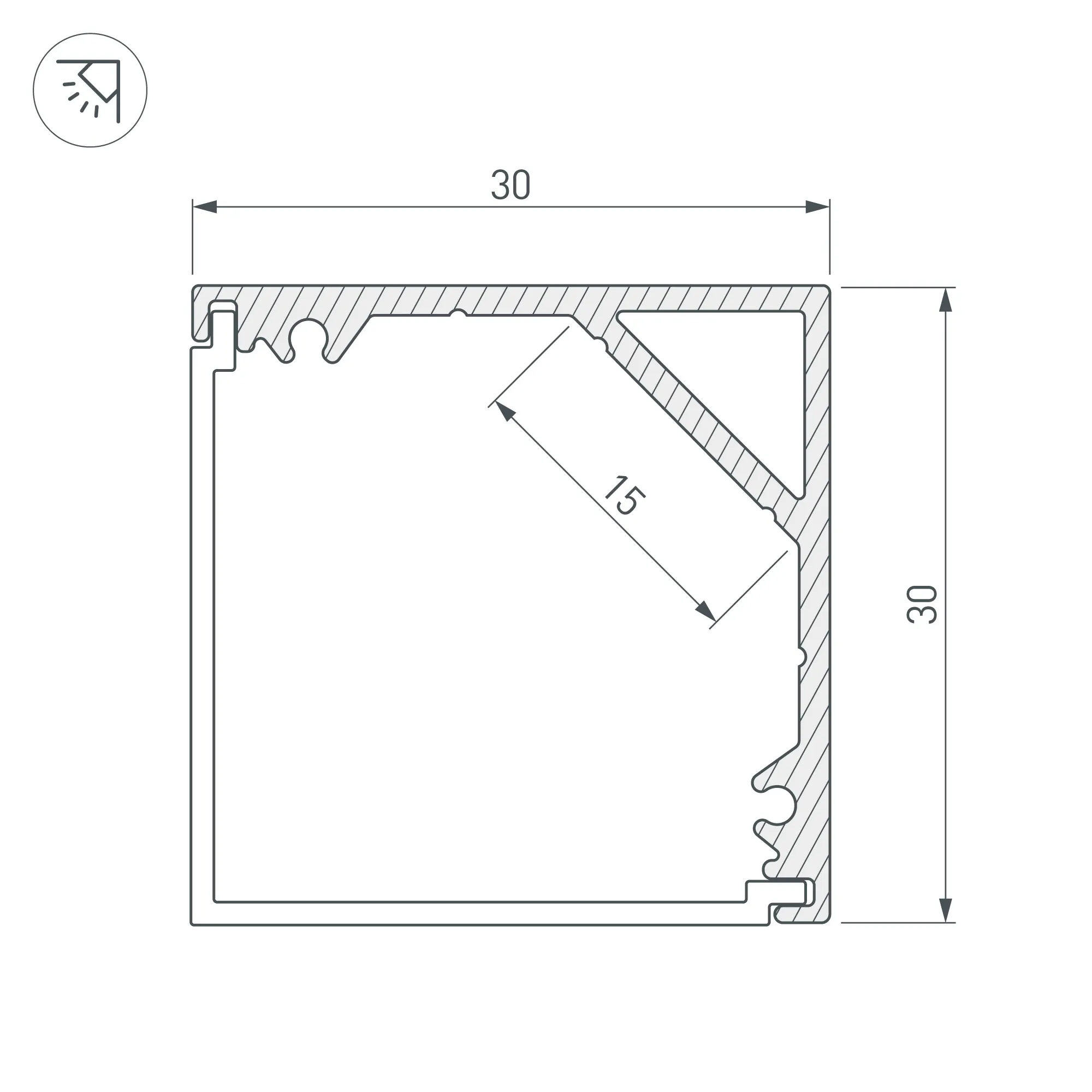 Алюминиевый анодированный угловой профиль для светодиодных лент и линеек. Габаритные размеры (L×W×H): 2000x30x30 мм. Ширина площадки для ленты 15 мм. Экраны, заглушки и другие аксессуары приобретаются отдельно. Цена за 1 метр.