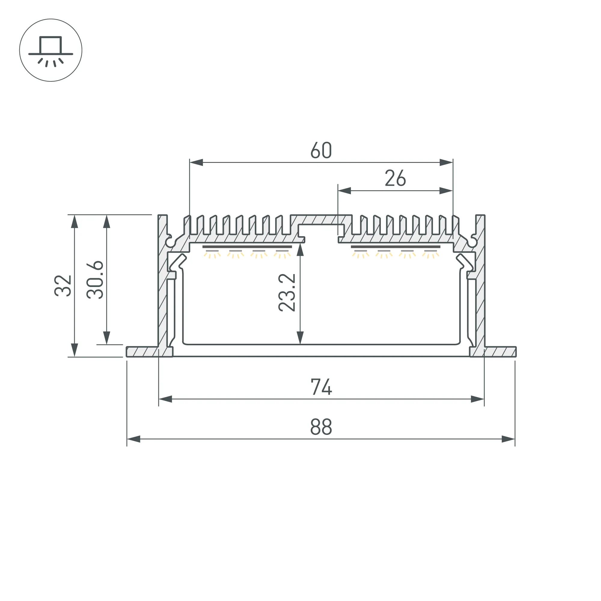Комплект с экраном. Алюминиевый профиль для светодиодных лент и линеек. Цвет - белый RAL9003 (порошковая окраска). Габаритные размеры (L×W×H): 2500x88x32 мм, паз для установки 74 мм. Ширина площадки для ленты 60 мм. Аксессуары приобретаются отдельно.