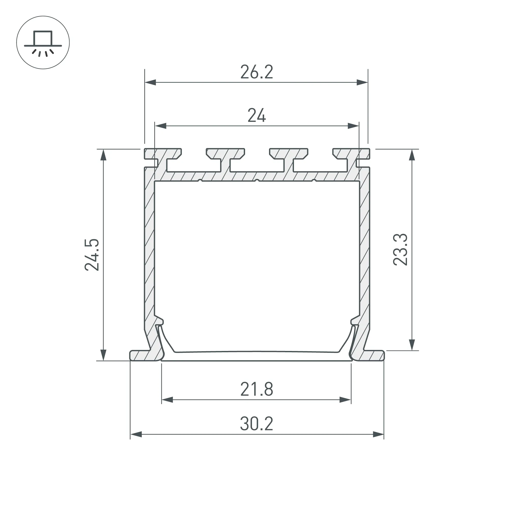 3м под заказ. Алюминиевый анодированный встраиваемый профиль для светодиодных лент и линеек. Габаритные размеры (L×W×H): 3000x30x25 мм. Ширина площадки для ленты 24 мм. Экраны, заглушки и другие аксессуары приобретаются отдельно. Цена за 1 метр.