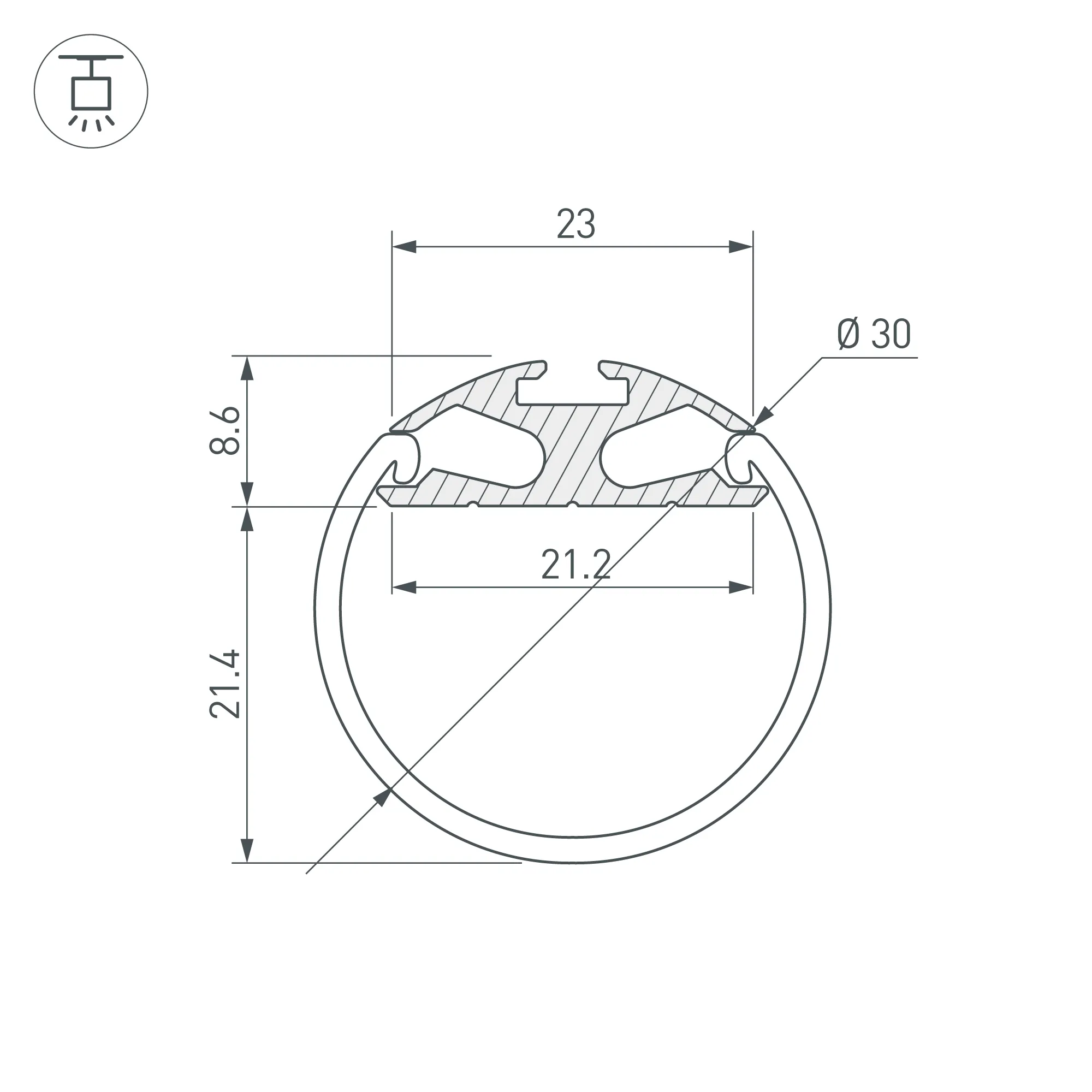 Алюминиевый анодированный профиль для светодиодных лент и линеек. Для создания круглых подвесных светильников, угол освещения до 180°. Габаритные размеры профиля (L×W×H): 2000x23x8,6 мм. Габаритные размеры профиля с экраном (L×D): 2000xD30 мм. Ширина площадки для ленты 21,2 мм. Экраны, заглушки и другие аксессуары приобретаются отдельно. Цена за 1 метр.