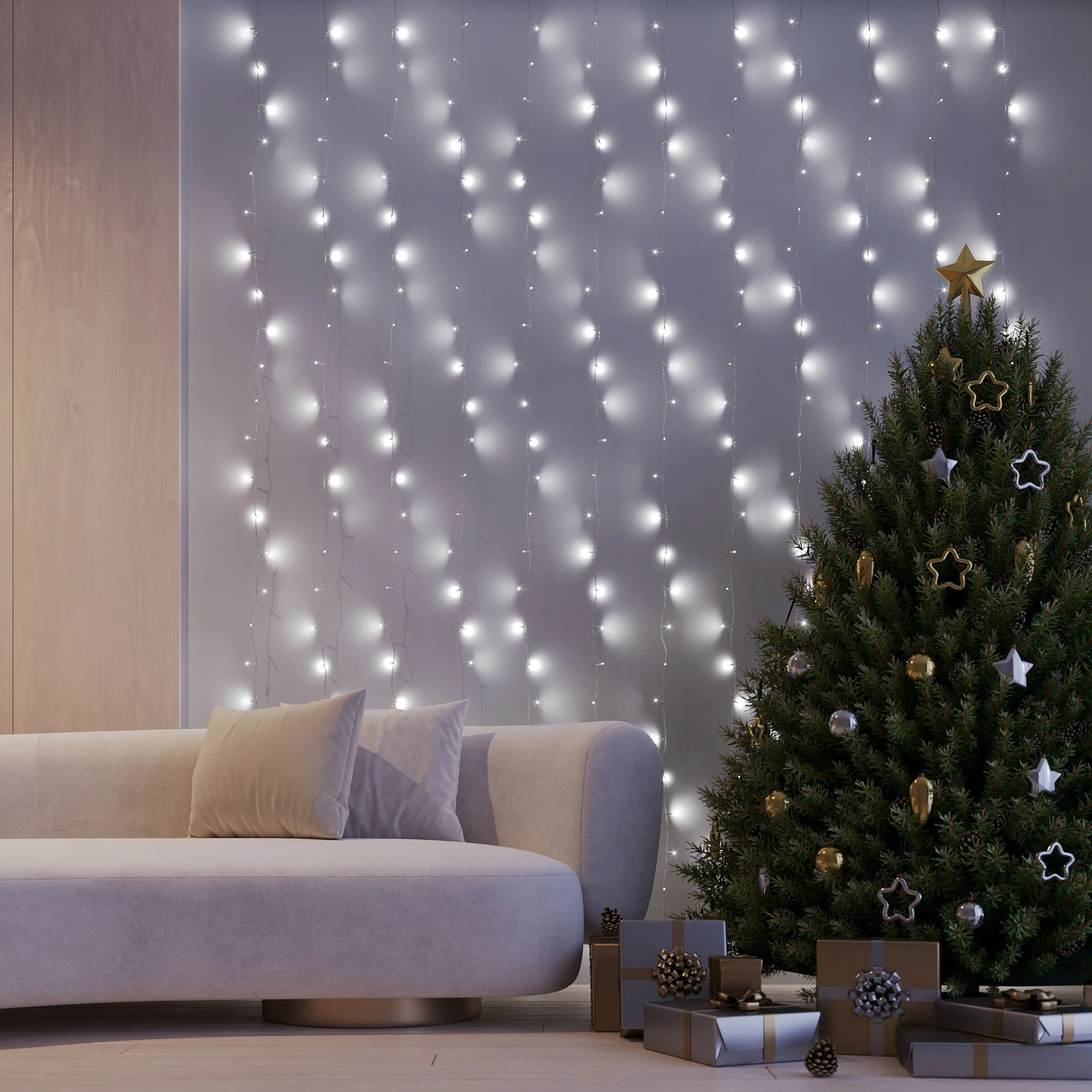 Светодиодный Занавес Home. Размер 2000x2500 мм (длина 2000 мм, высота 2500 мм). 12 ниспадающих нитей длиной 2500 мм. 300 светодиодов размером 5 мм. Цвет свечения БЕЛЫЙ (6000 К), постоянное свечение и 8 динамических эффектов с резким световым рисунком (прозрачная вогнутая линза). Провод прозрачный, ПВХ. Питание 230 В, Мощность 12 Вт, защита IP20, применение в помещении. Аксессуар для подключения и выбора режима свечения в комплекте.