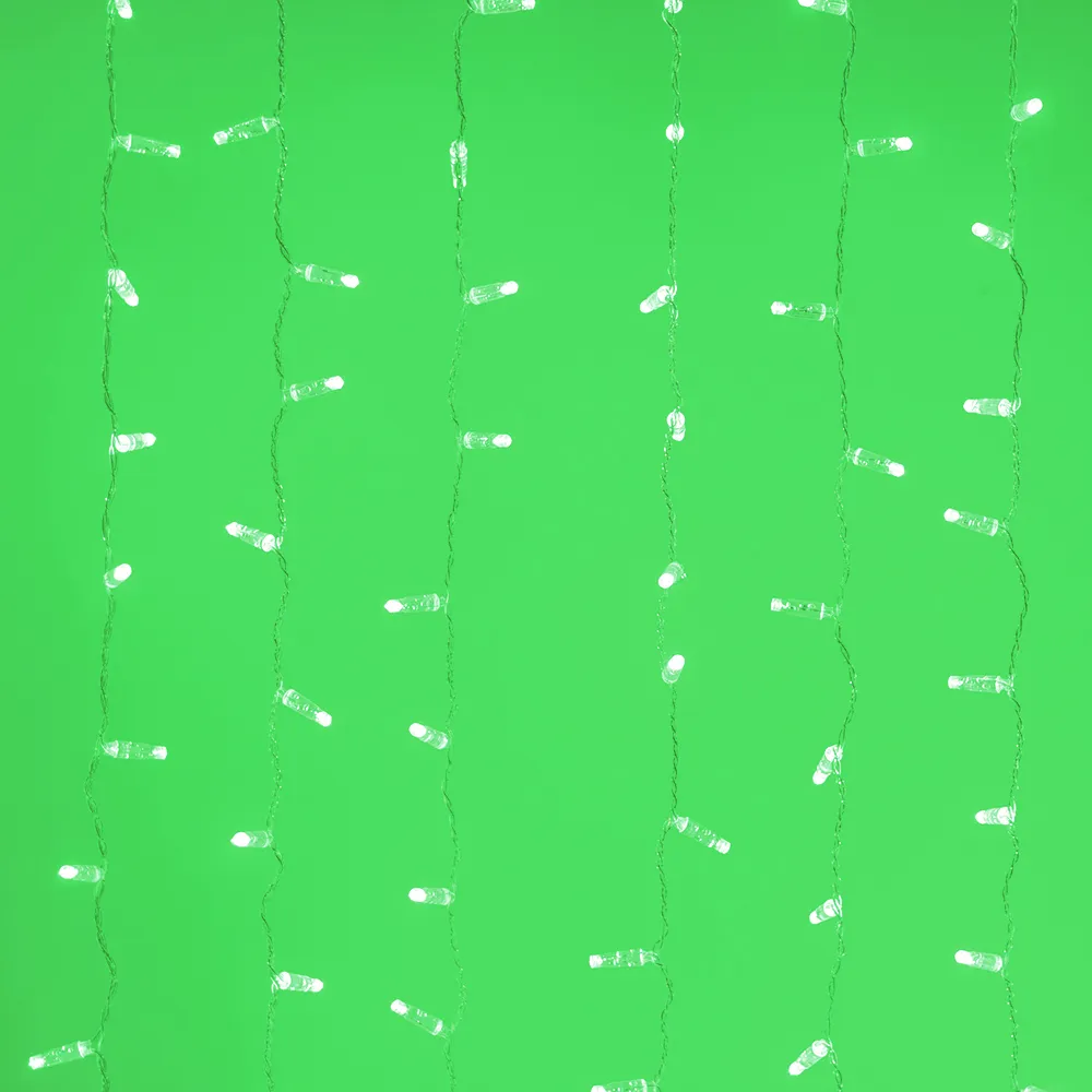 Светодиодный Занавес Classic. Размер 2000x3000 мм (длина 2000 мм, высота 3000 мм). 20 ниспадающих нитей длиной 3000 мм. 760 светодиодов размером 7 мм. Цвет свечения ЗЕЛЕНЫЙ, постоянное свечение и 8 динамических эффектов с резким световым рисунком (прозрачная вогнутая линза). Провод прозрачный, ПВХ. Питание 230 В, Мощность 60 Вт, защита IP65, применение в помещении и на улице под навесом. Аксессуар для подключения и выбора режима свечения в комплекте.