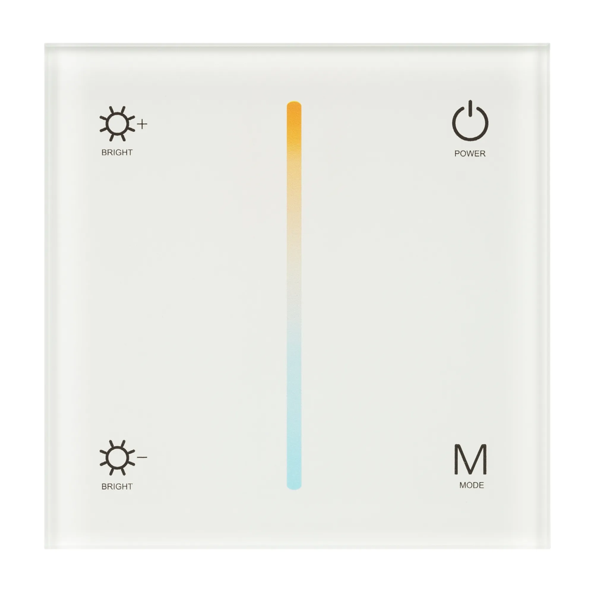 Встраиваемая сенсорная стеклянная панель 2.4 ГГц, цвет белый. Для управления температурой свечения (MIX/CCT) и яркостью с помощью сенсорной полосы. Работает в режиме master/slave и может выполнять функцию независимого контроллера. Питание/рабочее напряжение 12-24VDC, максимальный ток 3A на канал, 4 канала, максимальная мощность 144-288W. Габариты 86х86х35 мм. Панель совместима с контроллерами серии SMART.
