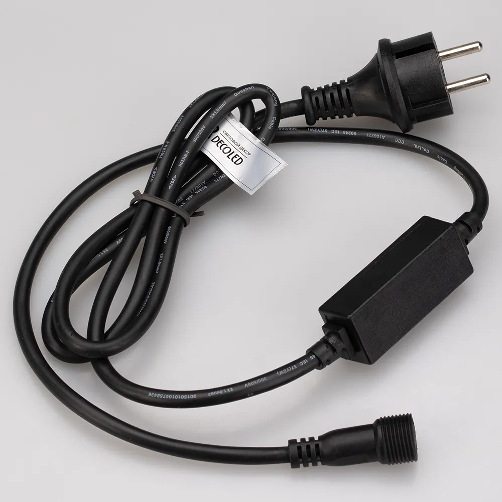 Шнур питания для светодиодных гирлянд постоянного свечения. Материал оболочки РЕЗИНА (каучук). Цвет провода чёрный. В комплект входит: шнур питания с вилкой европейского стандарта (IP44), 2pin разъём подключения к гирлянде, выпрямитель AC/DC (1.6A). Длина провода 1.5 метра.