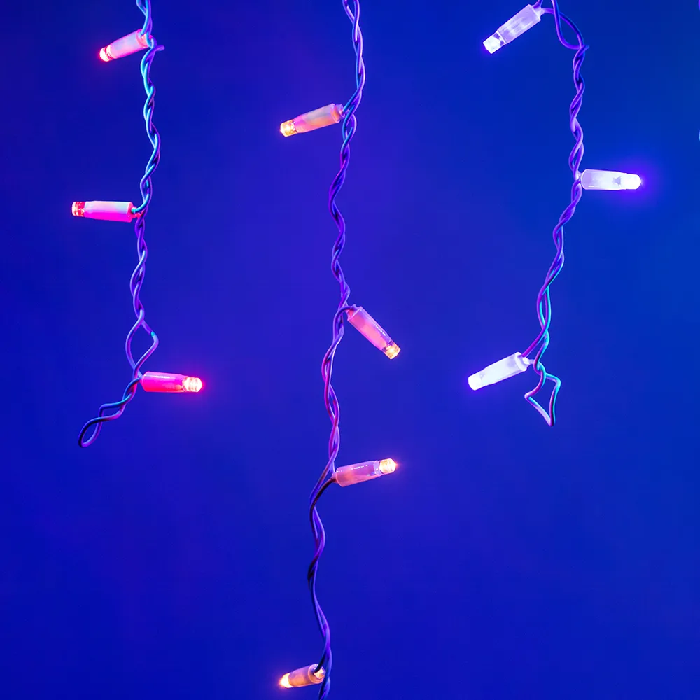 Светодиодная бахрома Classic. Размер 2400 мм (длина 2400 мм, по длине 24 нити высотой 200 / 600 мм). Цвет свечения RGB (цвет светодиодов чередуется), динамические и статические эффекты свечения свечения с резким световым рисунком (прозрачная вогнутая линза). Провод белый, ПВХ. Питание 230 В, Мощность 6 Вт, защита IP65, применение на улице под навесом. Аксессуары для подключения приобретаются отдельно.