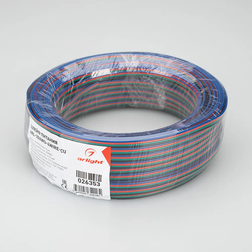 Шлейф для питания и управления мультицветными (RGB) светодиодными лентами. 4 проводника, калибр проводника 20AWG, сечение проводника 0.52 мм², проводник из луженой меди, внешняя оболочка из ПВХ синего, красного, зелёного и чёрного цветов. Длина кабеля в бухте — 50 метров.