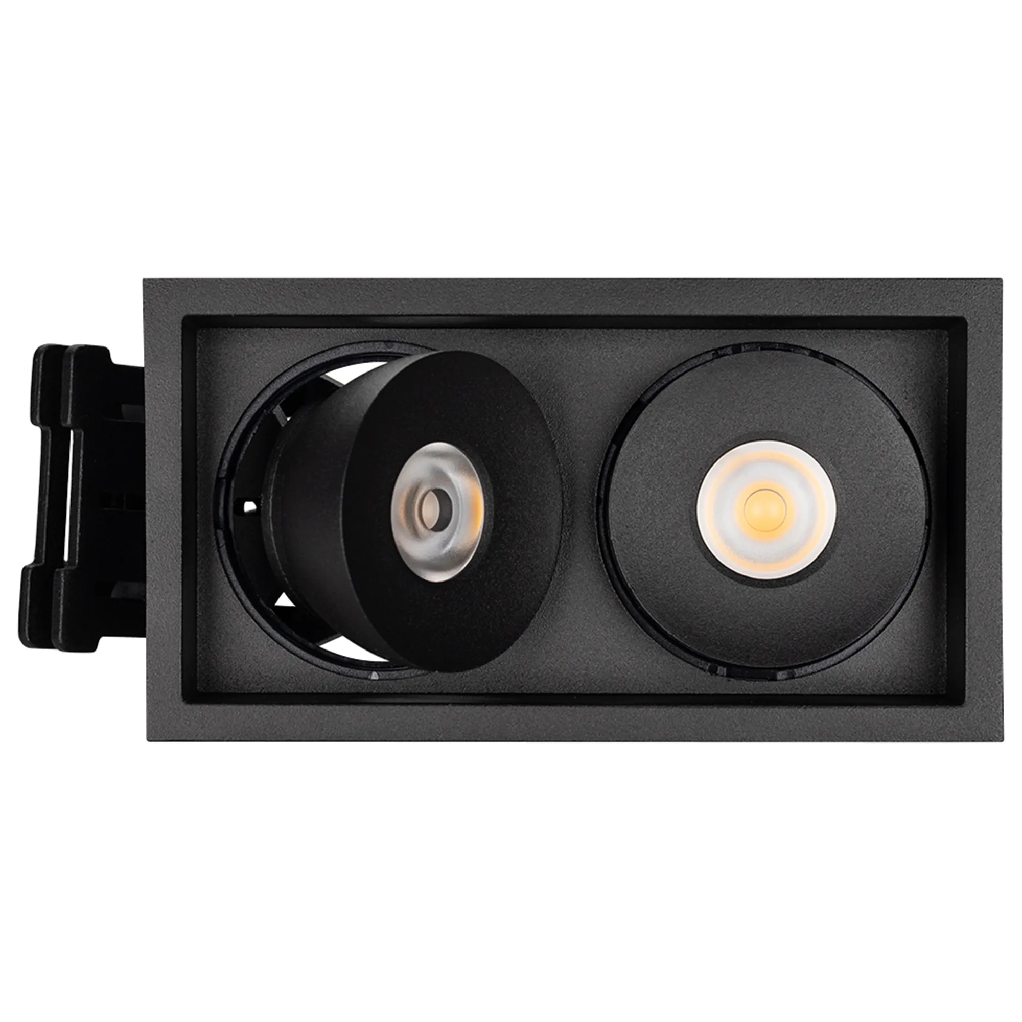 Встраиваемый поворотный светильник для потолка. Мощность 2x9W, цвет ТЕПЛЫЙ 3000K, св.поток 1260лм, угол 45°, RA>90. Корпус прямоугольный черный. Питание AC180-240V. Размеры LxWxH 148x80x90мм. Установка в отверстие 140x70мм. Драйвер в комплекте 2 шт (30-45V, 220mA).