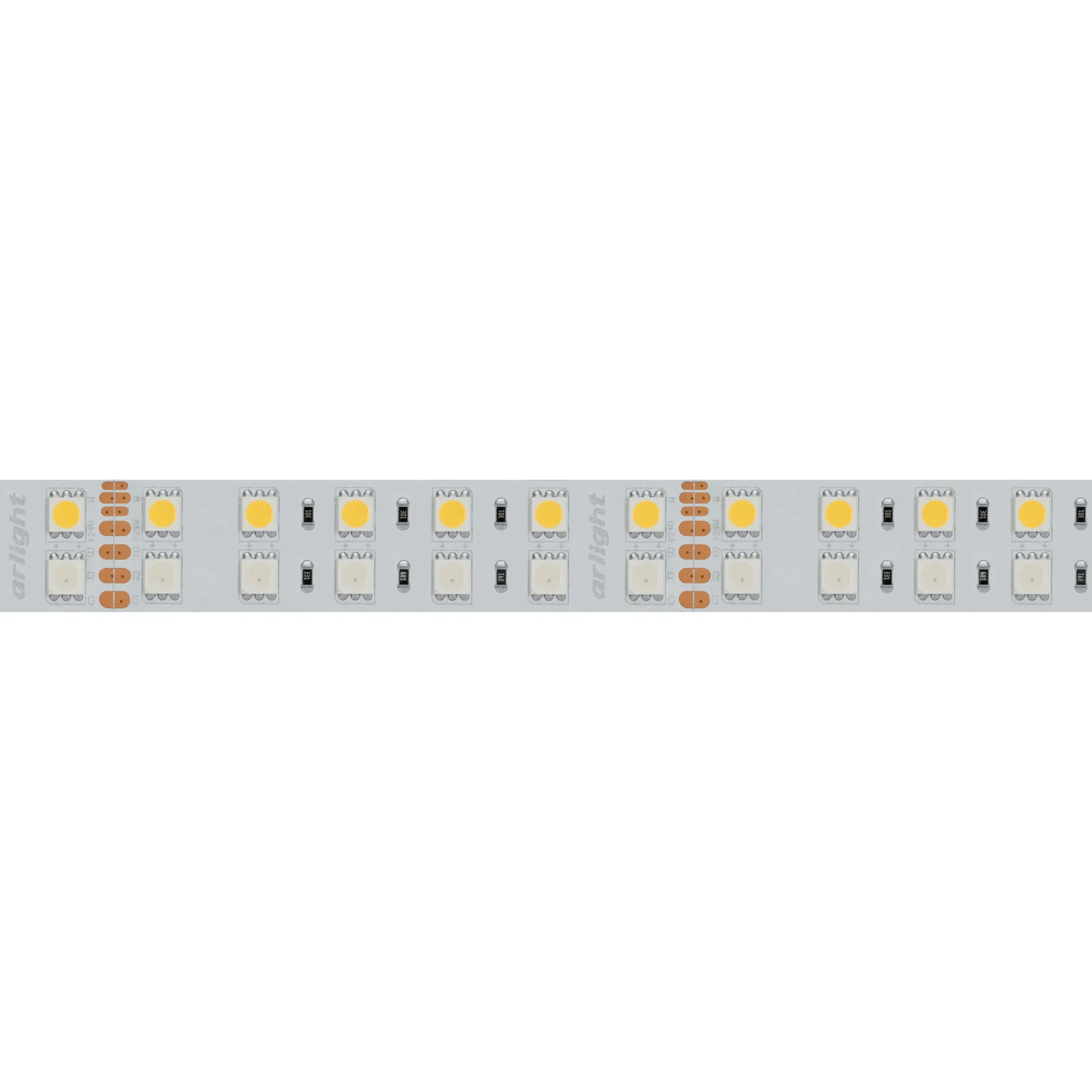 RGB+White мультицветная лента, 2 ряда светодиодов smd 5060, 144шт/м (720шт на 5м), белая плата 19мм, скотч 3М. Цвет Мультицвет R/G/B+Белый 6000K. Питание 24V, мощность 160 Вт на 5м, из них R/G/B=16 Вт/м (5.3 Вт/м канал), белый W=16 Вт/м, угол 120°. Размеры 5000х19х2.2мм. Мин.отрезок 83.3мм, 12 светодиодов. Цена за 1м.
