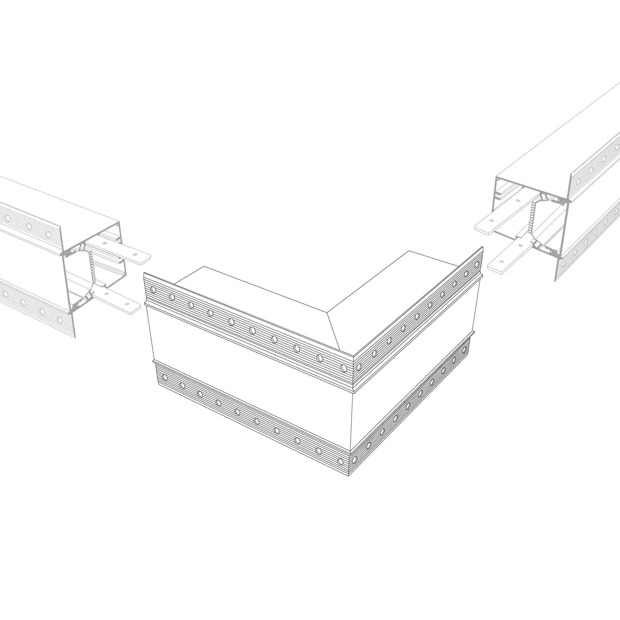 Угол в сборе, для профиля SL-LINIA55-FANTOM. Свечение наружу. В комплекте угол с экраном, соединители, винты, шестигранный ключ.