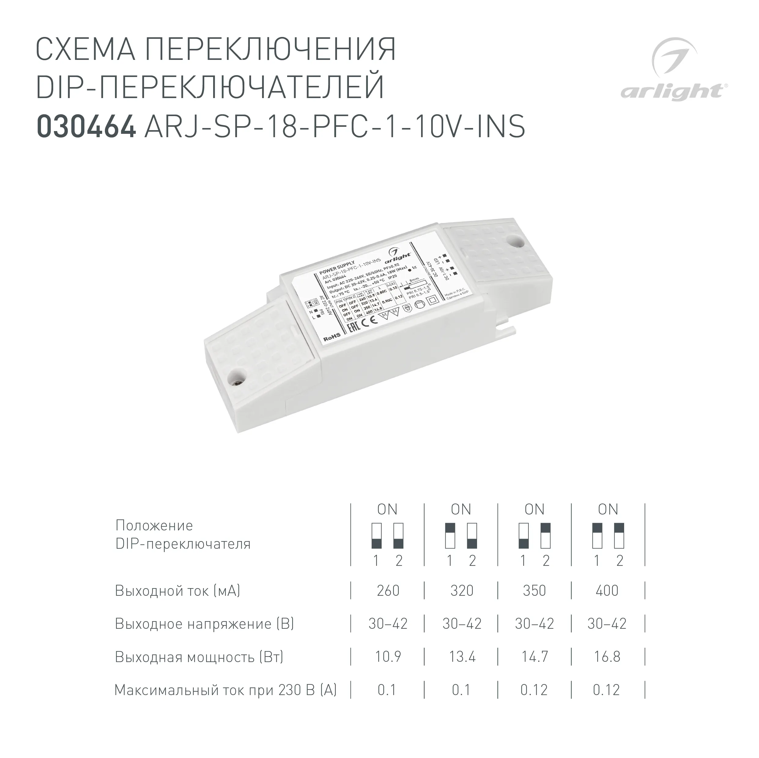 Блок питания ARJ-SP-18-PFC-1-10V-INS (18W, 250-400mA) (Arlight, IP20 Пластик, 5 лет)