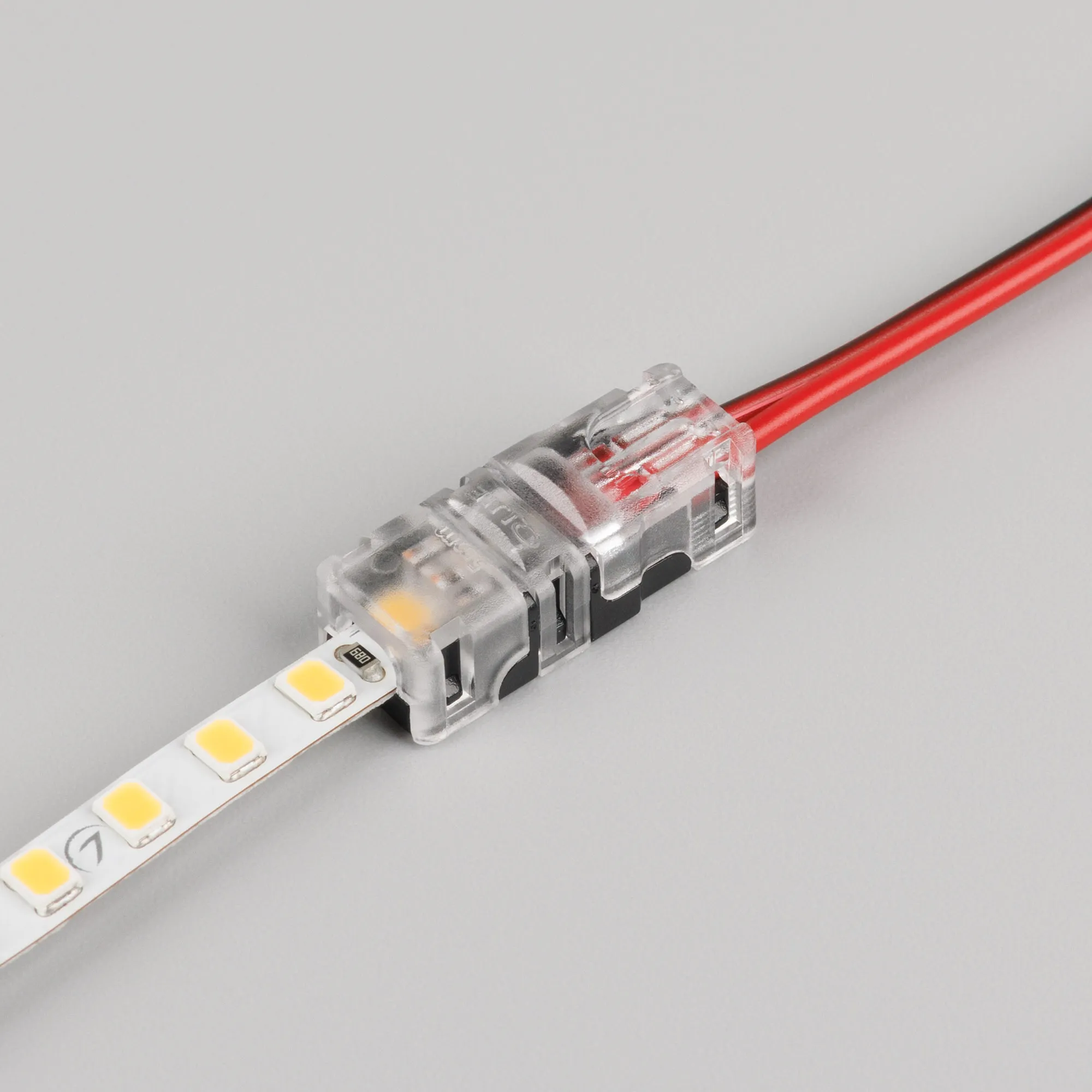 Одиночный коннектор (без провода) для подключения питания к одноцветным открытым лентам шириной 5 мм. Очистка провода питания (0,34-0,75 мм2) от изоляции не требуется. Материал - прозрачный пластик. Максимальный допустимый ток 3 А, напряжение 3-24 В. Цена за 1 шт.