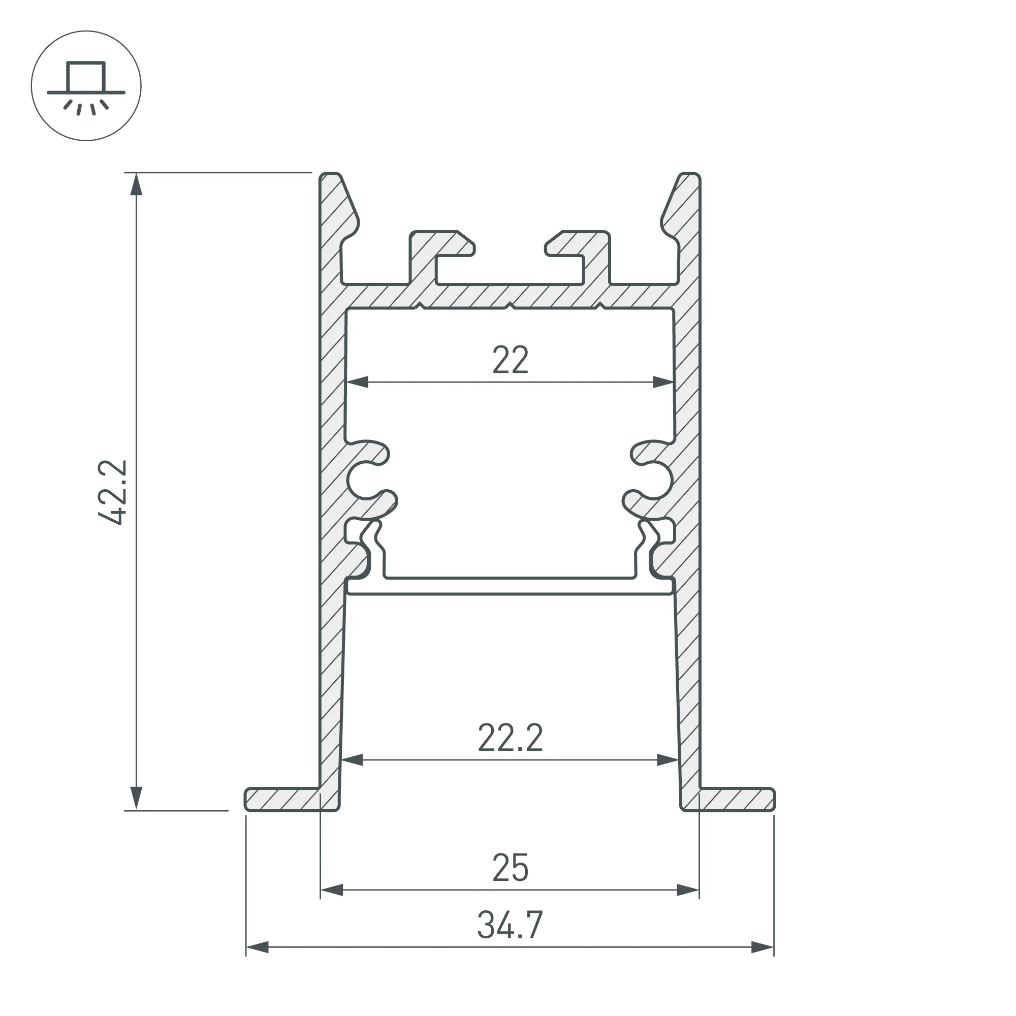 Алюминиевый анодированный профиль для светодиодных лент и линеек. Цвет - чёрный. Экран утоплен в плоскости профиля, что позволяет скрыть источник света от прямого контакта с глазами. Габаритные размеры (L×W×H): 2000x34,7x42,2 мм, паз для установки 25 мм. Ширина площадки для ленты 22 мм. Экраны, заглушки и другие аксессуары приобретаются отдельно. Цена за 1 метр.