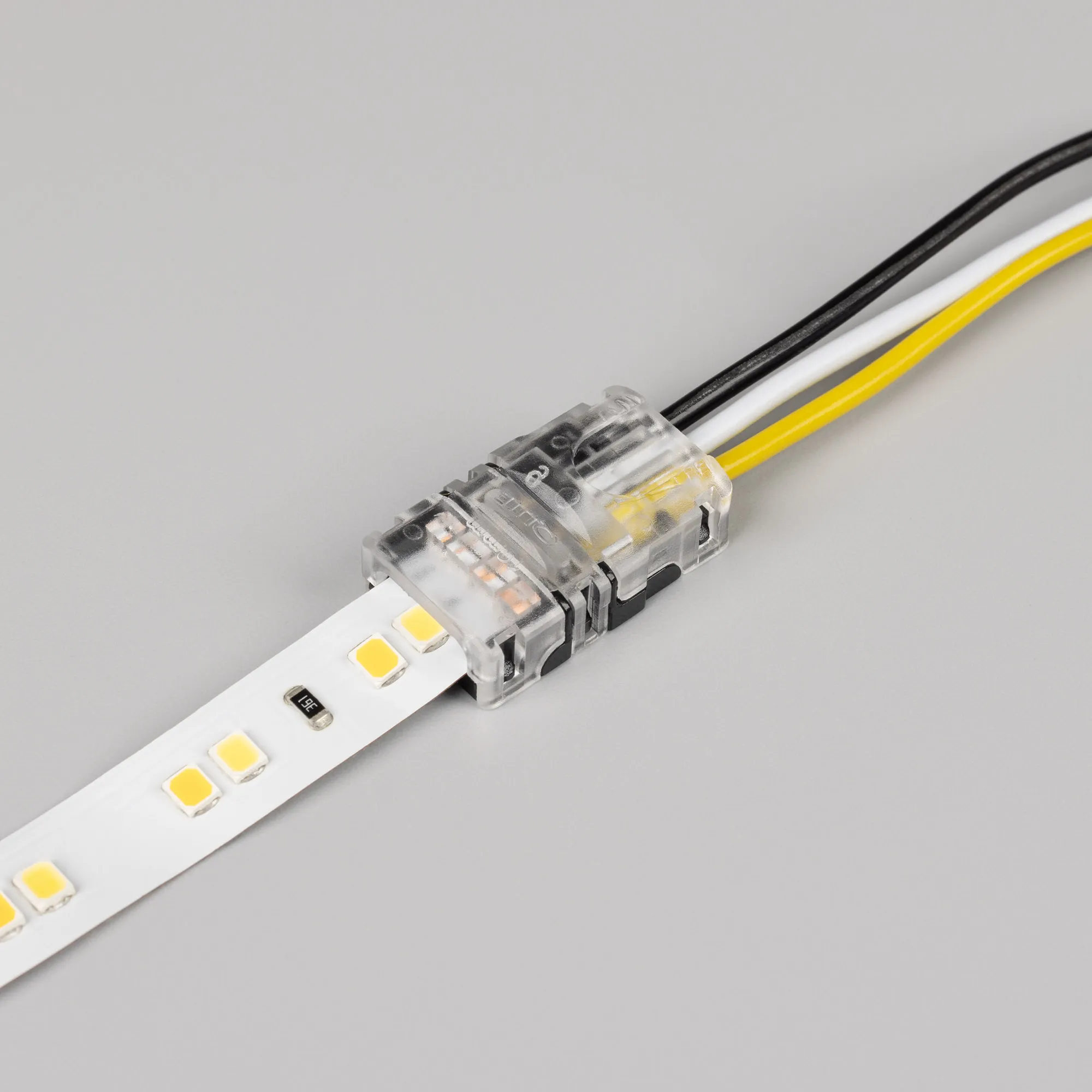 Одиночный коннектор (без провода) для подключения питания к открытым лентам MIX шириной 10 мм. Очистка провода питания (0,34-0,75 мм2) от изоляции не требуется. Материал - прозрачный пластик. Максимальный допустимый ток 3 А, напряжение 3-24 В, степень защиты IP33. Цена за 1 шт.