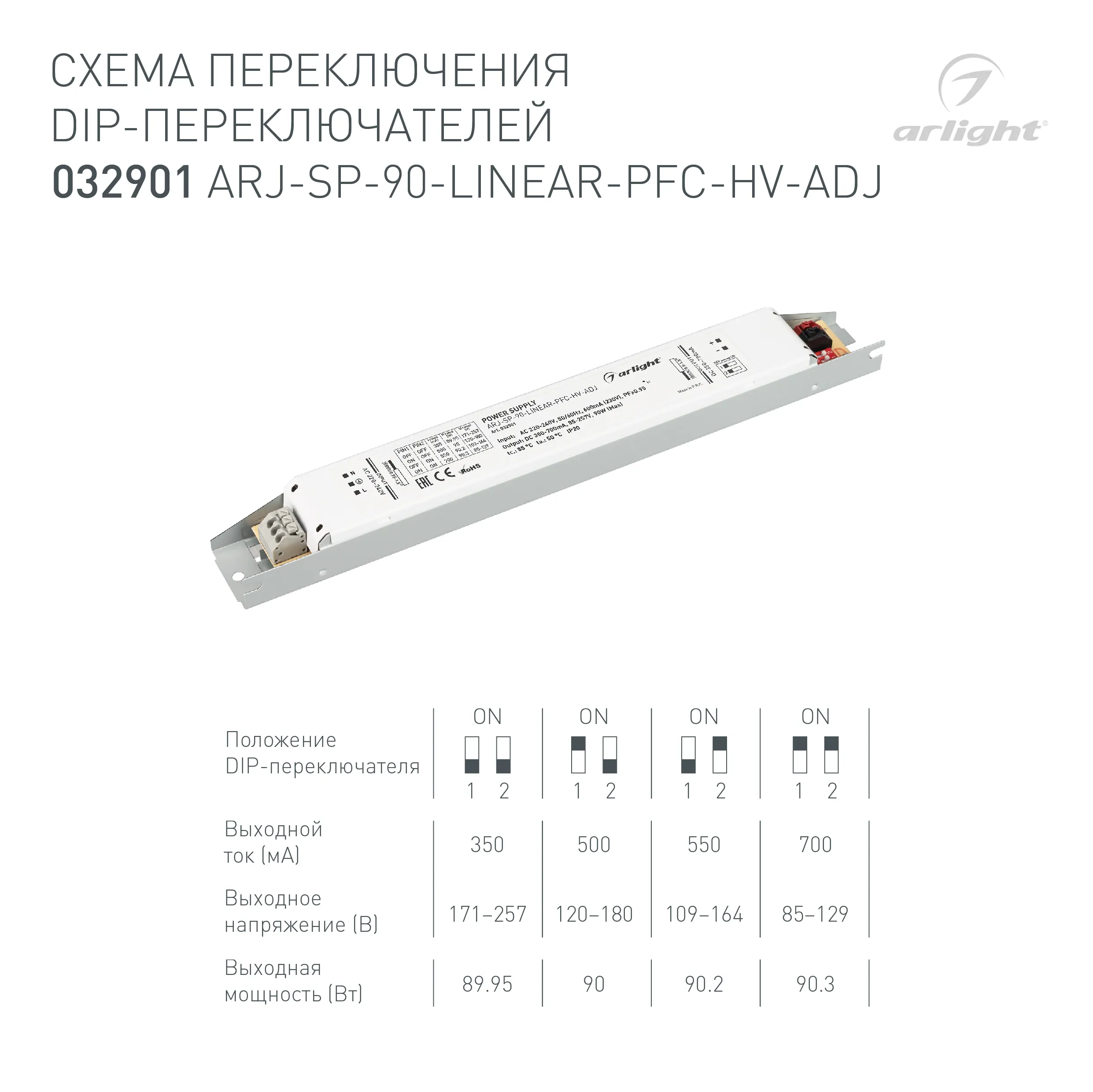 Наши специалисты знают все о продукции Arlight и с радостью помогут Вам выбрать комплектующие к товару "Блок питания ARJ-SP-90-LINEAR-PFC-HV-ADJ (90W, 350-700mA) (Arlight, IP20 Металл, 5 лет)", или другие товары из раздела "регулировка DIP-переключателем".