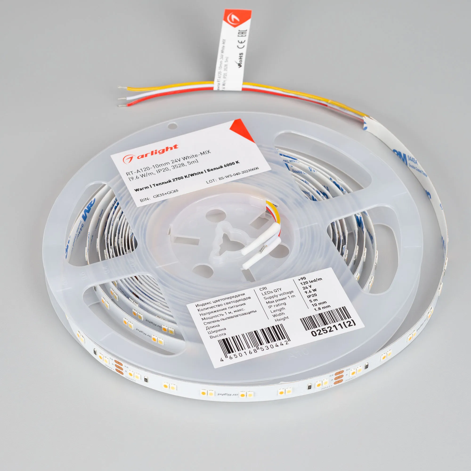 Светодиодная лента RT серии A120 с изменяемым цветом свечения. Светодиоды SMD 3528, 120 шт/м, белая плата шириной 10 мм, скотч 3M. Цвет MIX БЕЛЫЙ 6000K + ТЕПЛЫЙ 2700K, индекс цветопередачи CRI>90, угол 120°. Питание 24 В, мощность 9.6 Вт/м (48 Вт на 5 м). Размеры 5000x10x1.8 мм. Мин. отрезок 100 мм, 12 светодиодов. Цена за 1 м.