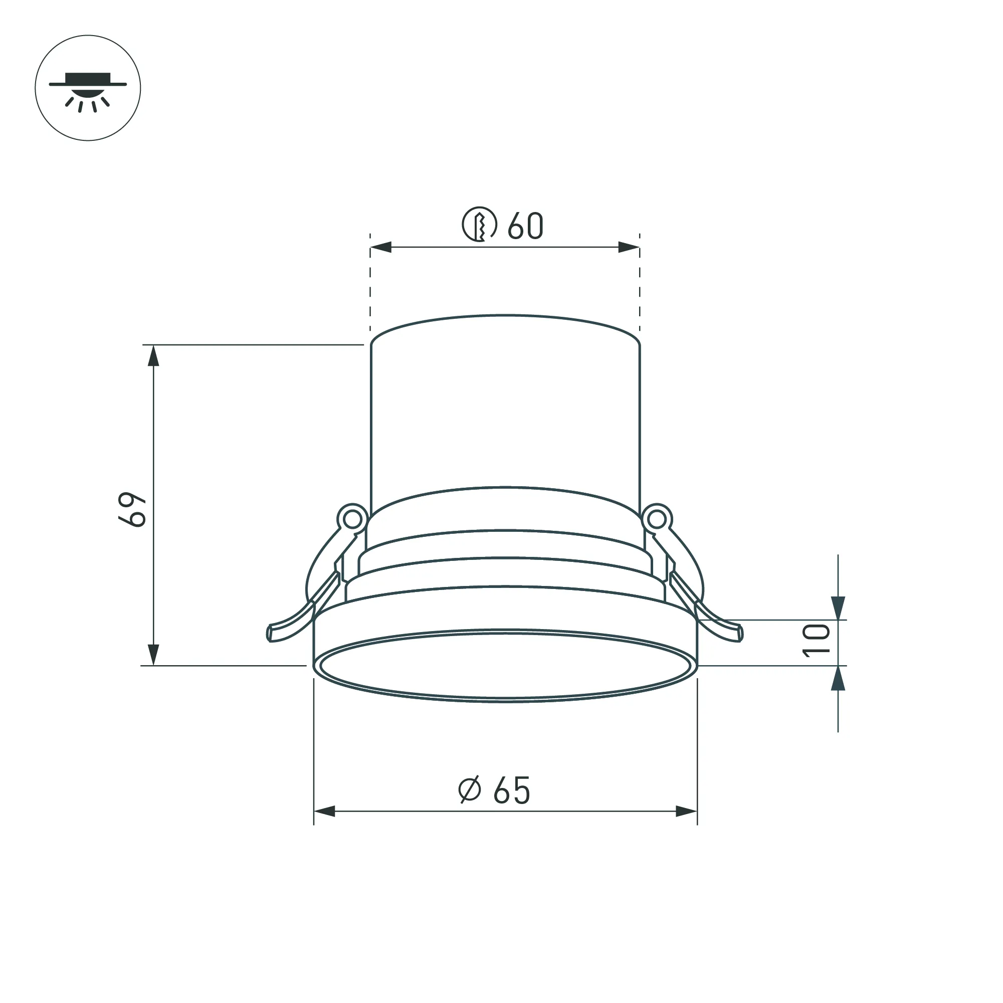Встраиваемый светильник даунлайт. Мощность 6 Вт, св. поток 560 лм, 93 лм/Вт, теплый 3000 K, CRI>90, UGR<16, угол 38°, напряжение питания 230 В. Белый круглый корпус из алюминия, степень защиты IP20. Размер: диаметр 65 мм, высота 69 мм. Монтаж встраиваемый, установочное отверстие: диаметр 60 мм. Драйвер 28-42 В, 150 мА, пульсация <2%.