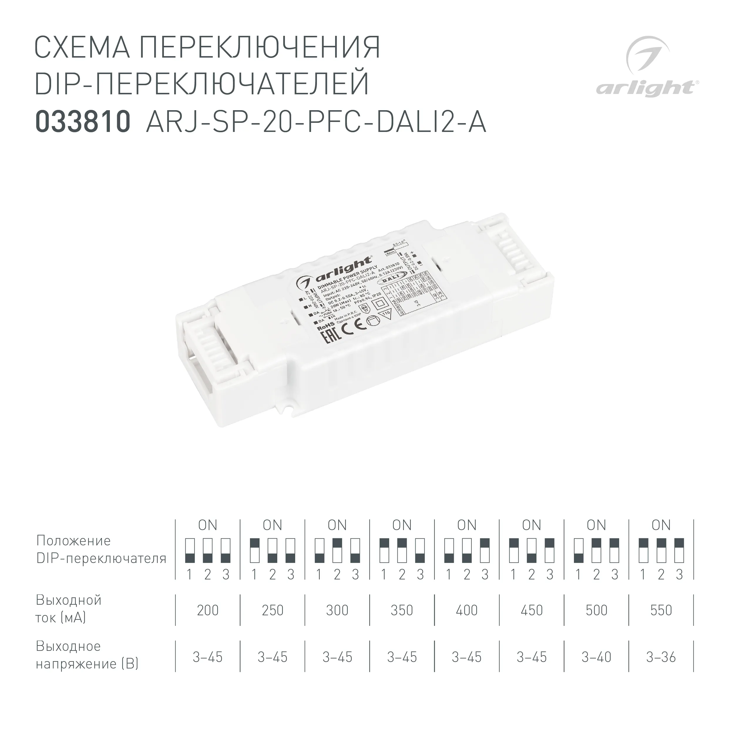 Блок питания ARJ-SP-20-PFC-DALI2-A (20W, 3-45V, 0.2-0.55 A) (Arlight, IP20 Пластик, 5 лет)