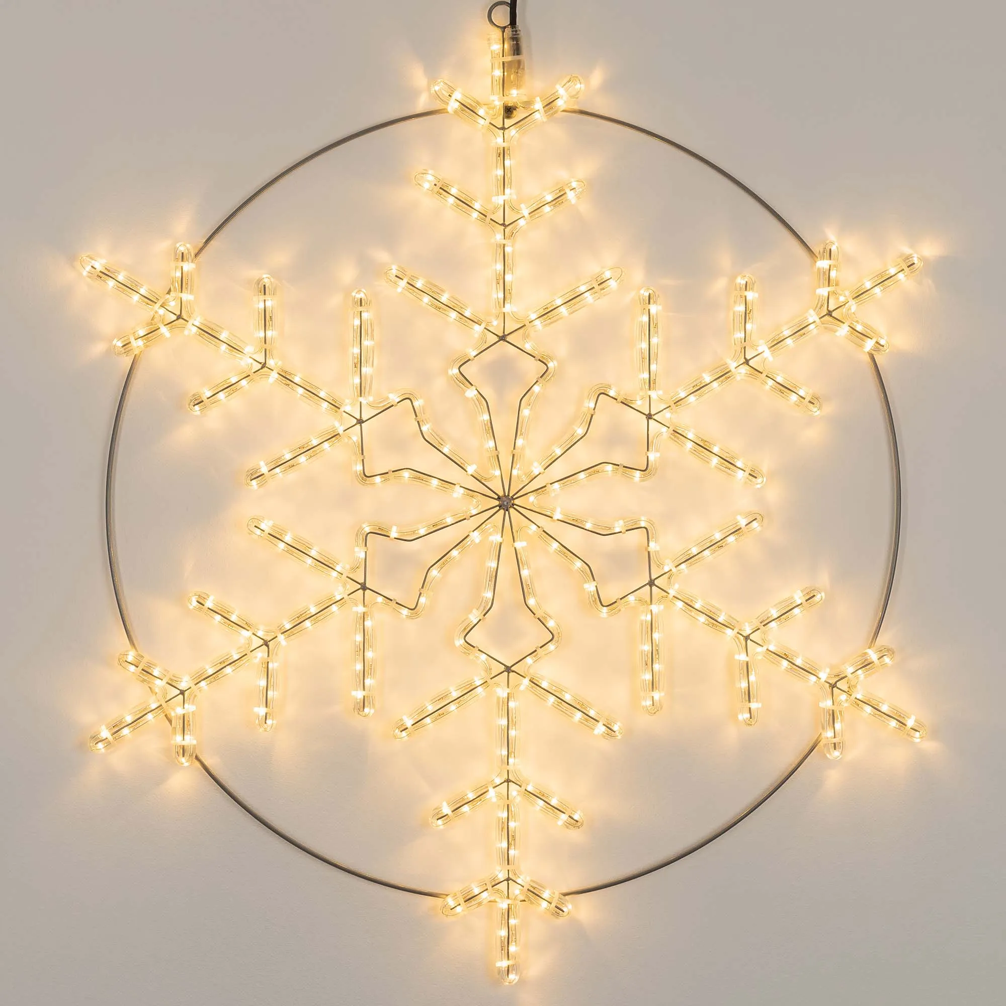Светодиодная фигура СНЕЖИНКА. Размер 920x920 мм. Цвет светодиодов ТЕПЛЫЙ БЕЛЫЙ (3000 К), постоянное свечение. 432 светодиода. Напряжение питания 230 В, потребляемая мощность 30 Вт, степень пылевлагозащиты IP65. Фигура укомплектована проводом питания для подключения к сети 230 В (без вилки питания).