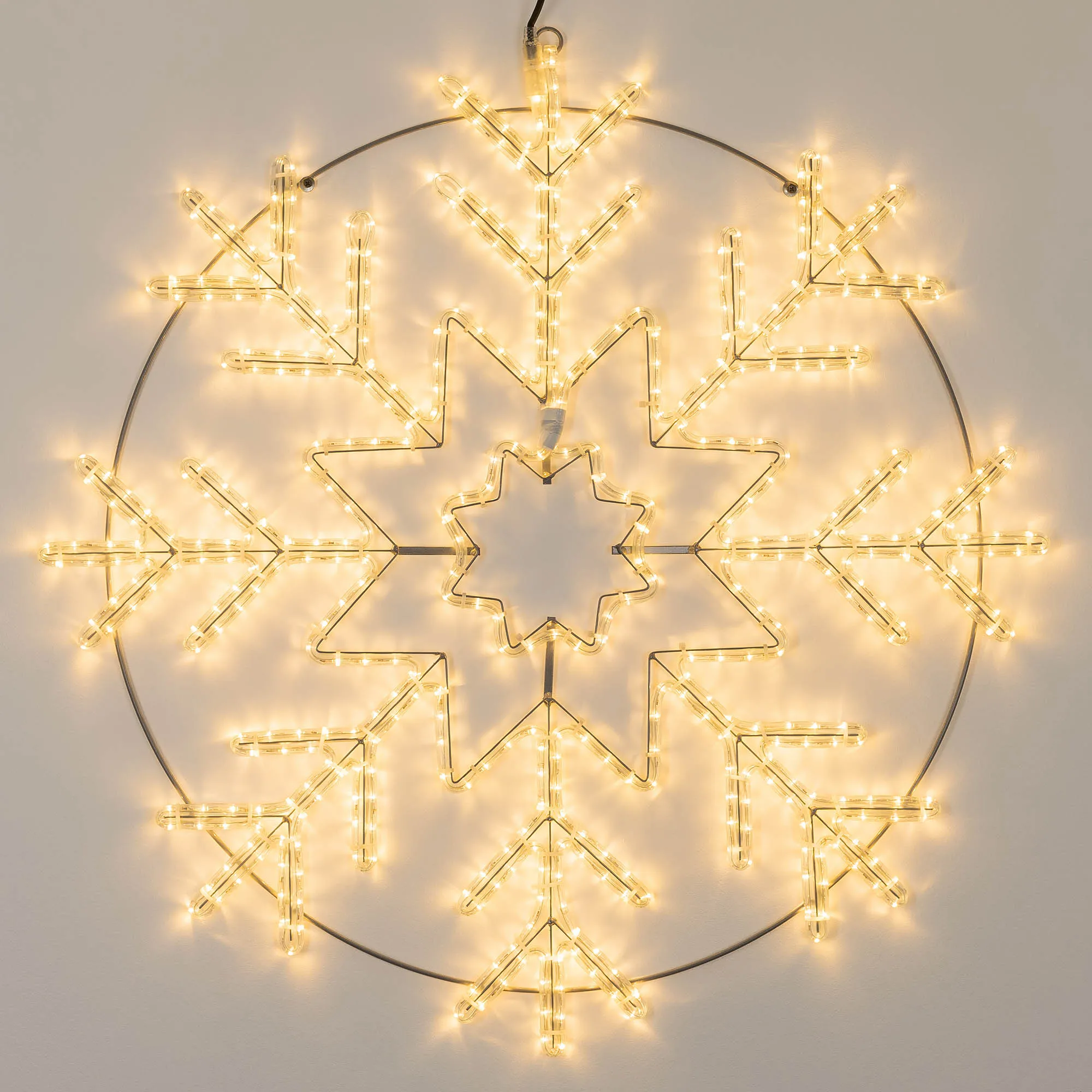 Светодиодная фигура СНЕЖИНКА. Размер 950x950 мм. Цвет светодиодов ТЕПЛЫЙ БЕЛЫЙ (3000 К), постоянное свечение. 540 светодиодов. Напряжение питания 230 В, потребляемая мощность 33 Вт, степень пылевлагозащиты IP65. Фигура укомплектована проводом питания для подключения к сети 230 В (без вилки питания).