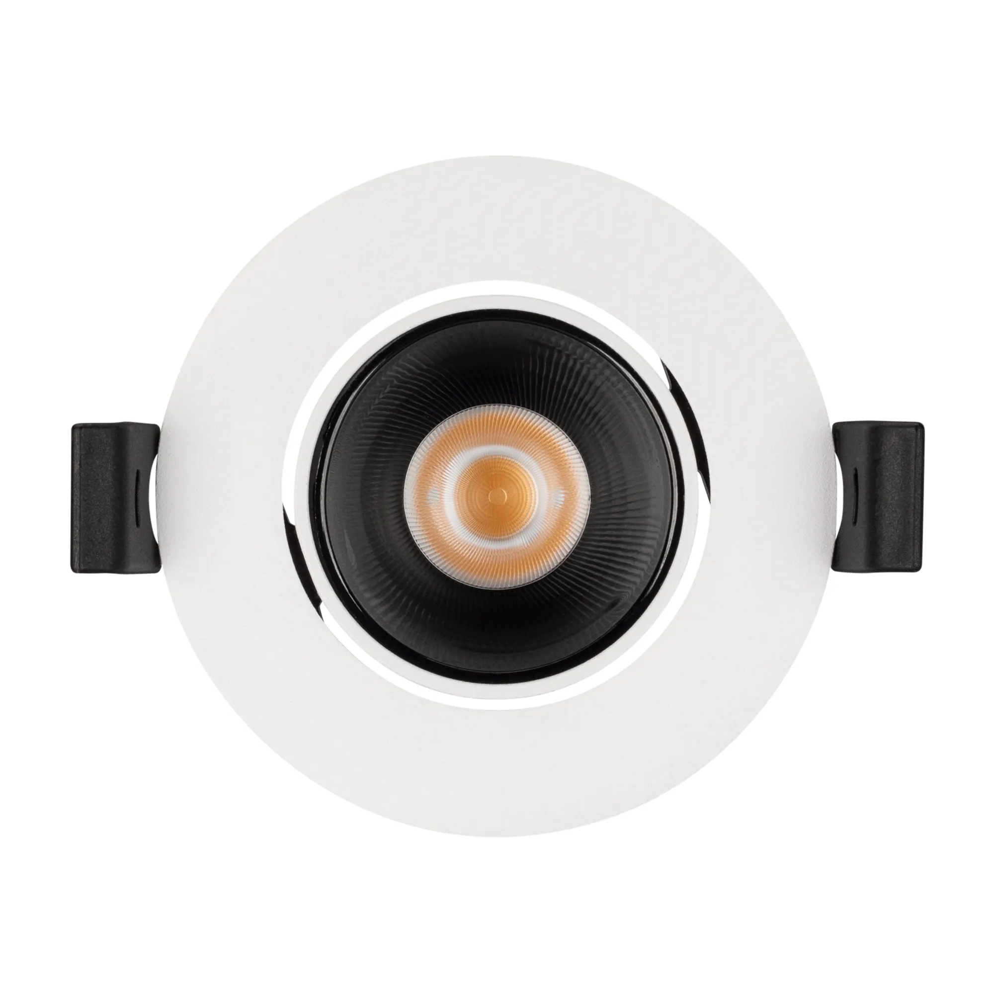 Встраиваемый поворотный светильник даунлайт. Мощность 8.4 Вт, св. поток 700 лм, 83 лм/Вт, теплый 3000 K, CRI>90, UGR<16, угол 32°, напряжение питания 230 В. Белый круглый корпус из алюминия, черный ГЛЯНЦЕВЫЙ отражатель из PMMA, степень защиты IP20. Размер: диаметр 82 мм, высота 51 мм. Монтаж встраиваемый, установочное отверстие: диаметр 75 мм. Драйвер 21-42 В, 200 мА, пульсация <2%.