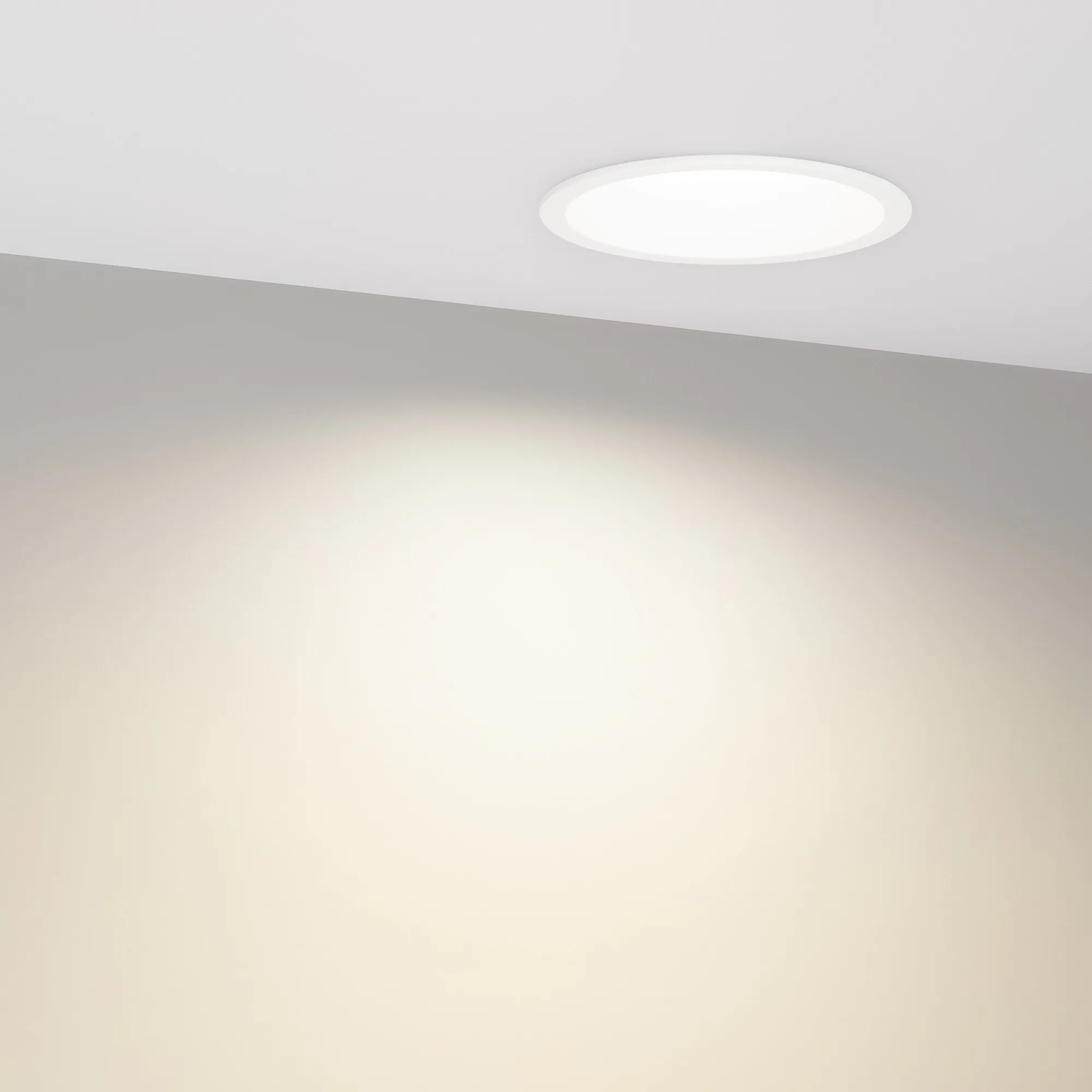 Встраиваемый светильник даунлайт. Мощность 12 Вт, св. поток 840 лм, 70 лм/Вт, дневной 4000 K, CRI>90, угол 90°, напряжение питания 230 В. Белый круглый корпус из алюминия, степень защиты IP20. Размер: диаметр 104 мм, высота 55 мм. Монтаж встраиваемый, установочное отверстие: диаметр 95 мм. Драйвер 27-42 В, 300 мА, пульсация <2%.