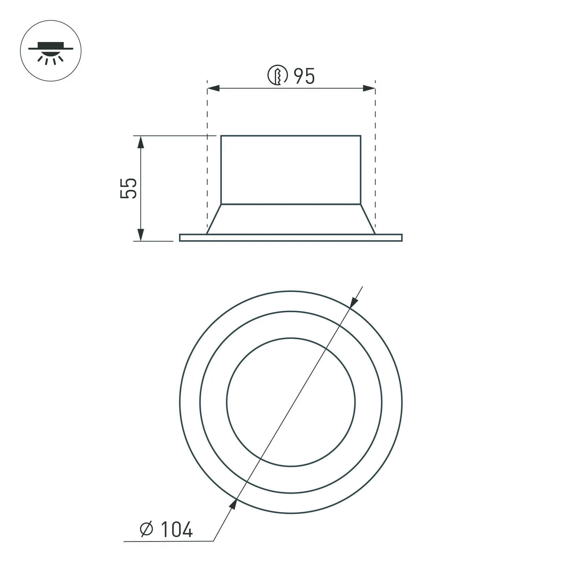 Встраиваемый светильник даунлайт. Мощность 12 Вт, св. поток 670 лм, 56 лм/Вт, дневной 4000 K, CRI>90, угол 85°, напряжение питания 230 В. Чёрный круглый корпус из алюминия, степень защиты IP20. Размер: диаметр 104 мм, высота 55 мм. Монтаж встраиваемый, установочное отверстие: диаметр 95 мм. Драйвер 27-42 В, 300 мА, пульсация <2%.