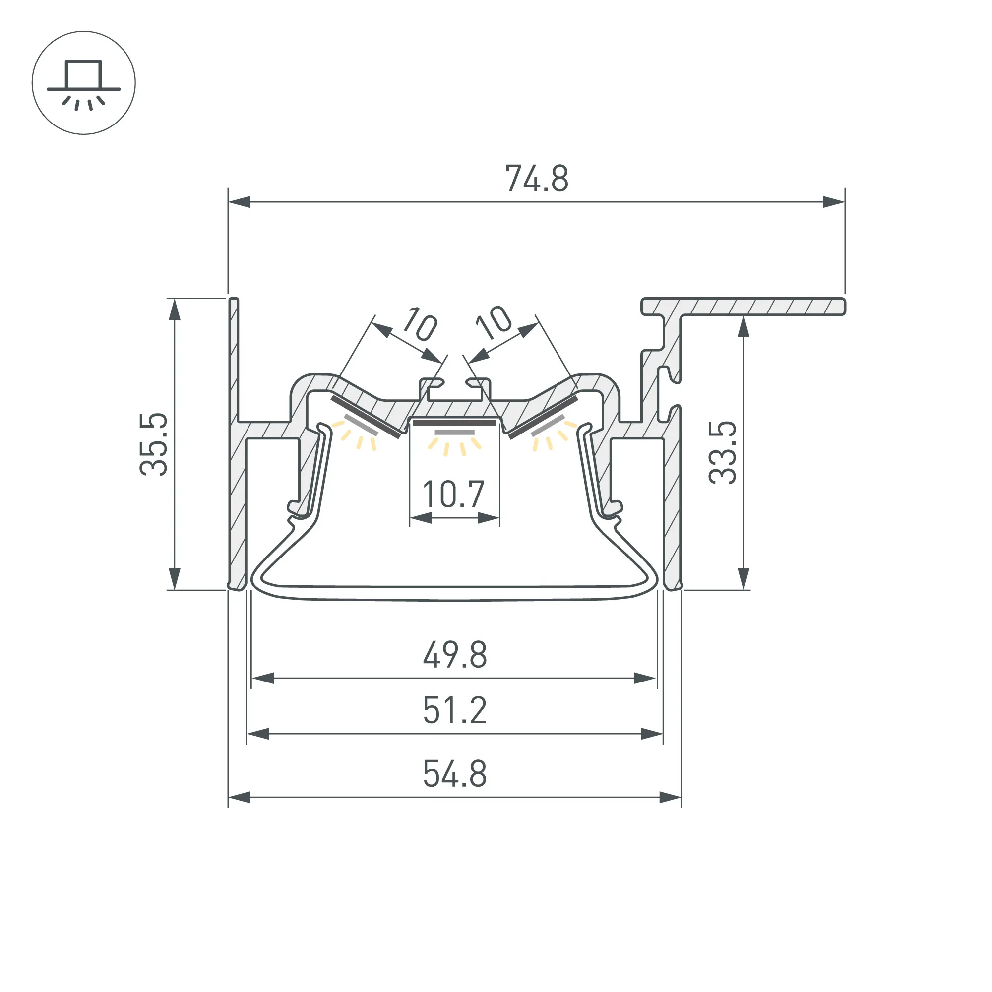 Алюминиевый профиль для натяжных потолков (боковая линия - монтаж к потолку). Решение 2-в-1 - каркас для крепления натяжного потолка и профиль для установки светодиодной ленты. Для дизайнерских решений «линии света» в натяжных потолках. Монтируется к потолку, накладной способ. Натяжной потолок крепится к профилю с одной стороны. Габаритные размеры (L×W×H): 2000x75x36мм. Ширина центральной площадки для ленты 11мм, боковых площадок - 10 мм. Экраны, заглушки и другие аксессуары приобретаются отдельно. Цена за 1 метр.