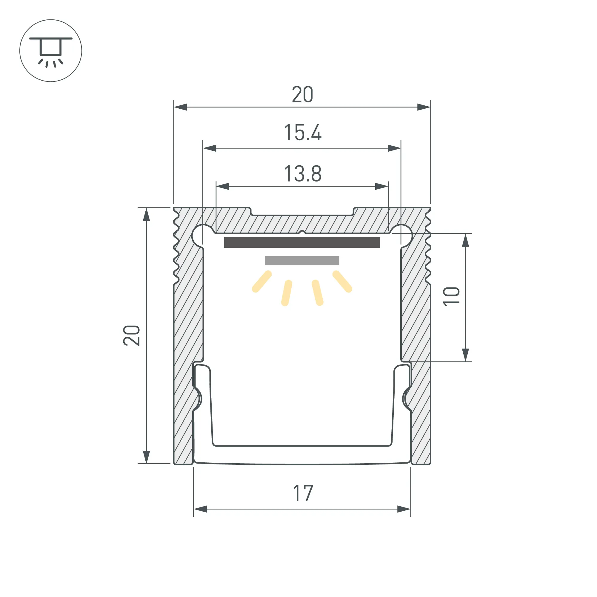 Комплект с экраном. Алюминиевый анодированный профиль для светодиодных лент и линеек. Габаритные размеры (L×W×H): 2000x20x20 мм. Ширина площадки для ленты 15 мм. Упакован в картонный тубус диаметром 27 мм.