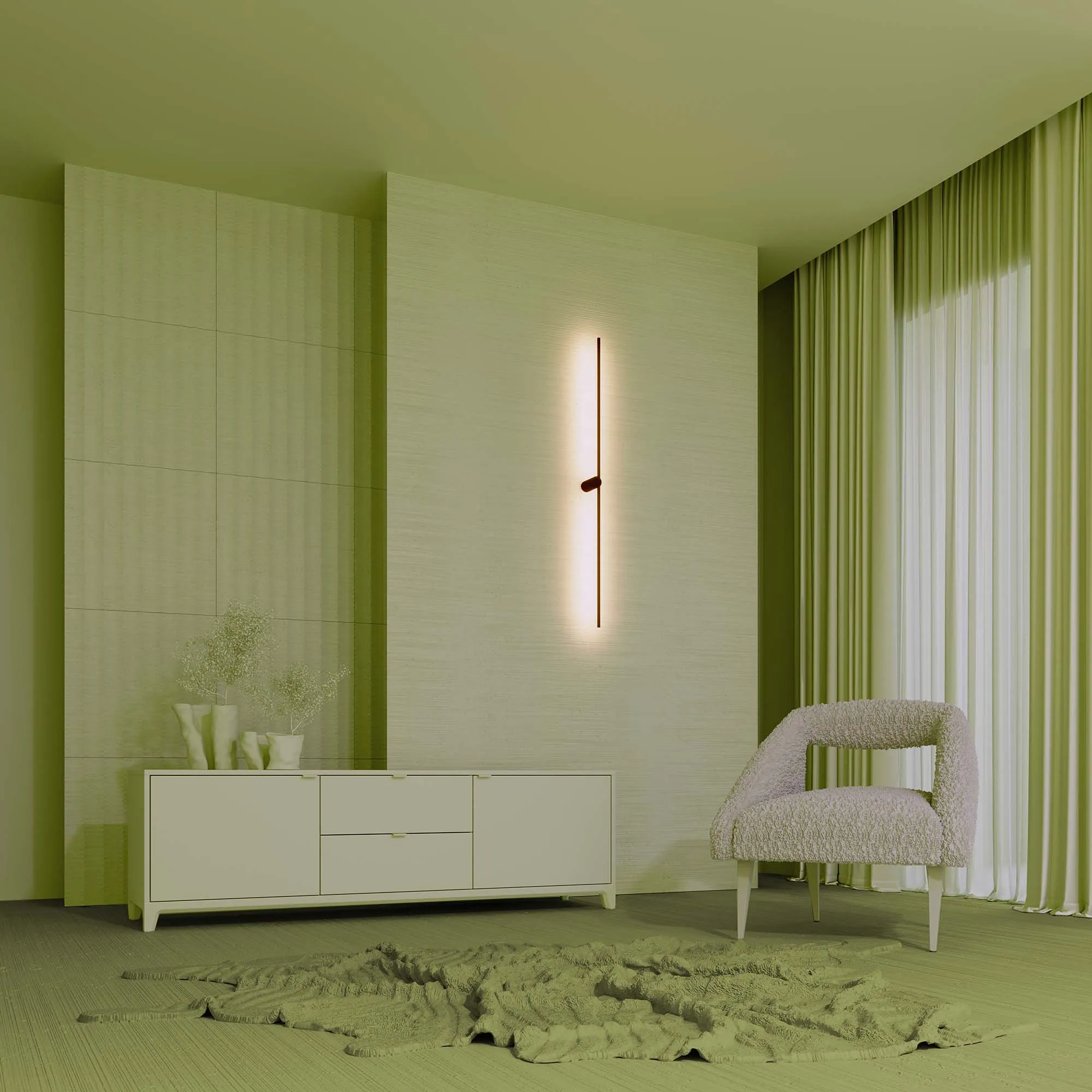 Декоративный настенный поворотный светильник с креплением в центре корпуса. Мощность 12 Вт, св. поток 400 лм, 37 лм/Вт, теплый 3000 K, CRI>80, угол 110°, напряжение питания 230 В. Черный фигурный корпус из алюминия, экран из поликарбоната , степень защиты IP20. Размер: длина1250 мм, ширина 55 мм, высота 102 мм. Монтаж накладной. Драйвер 5-12 В, 700 мА, пульсация <0,5%. Драйвер 5-12 В, 700 мА, пульсация <0,5%. Возможность поворота светоизлучателя на 355 градусов.