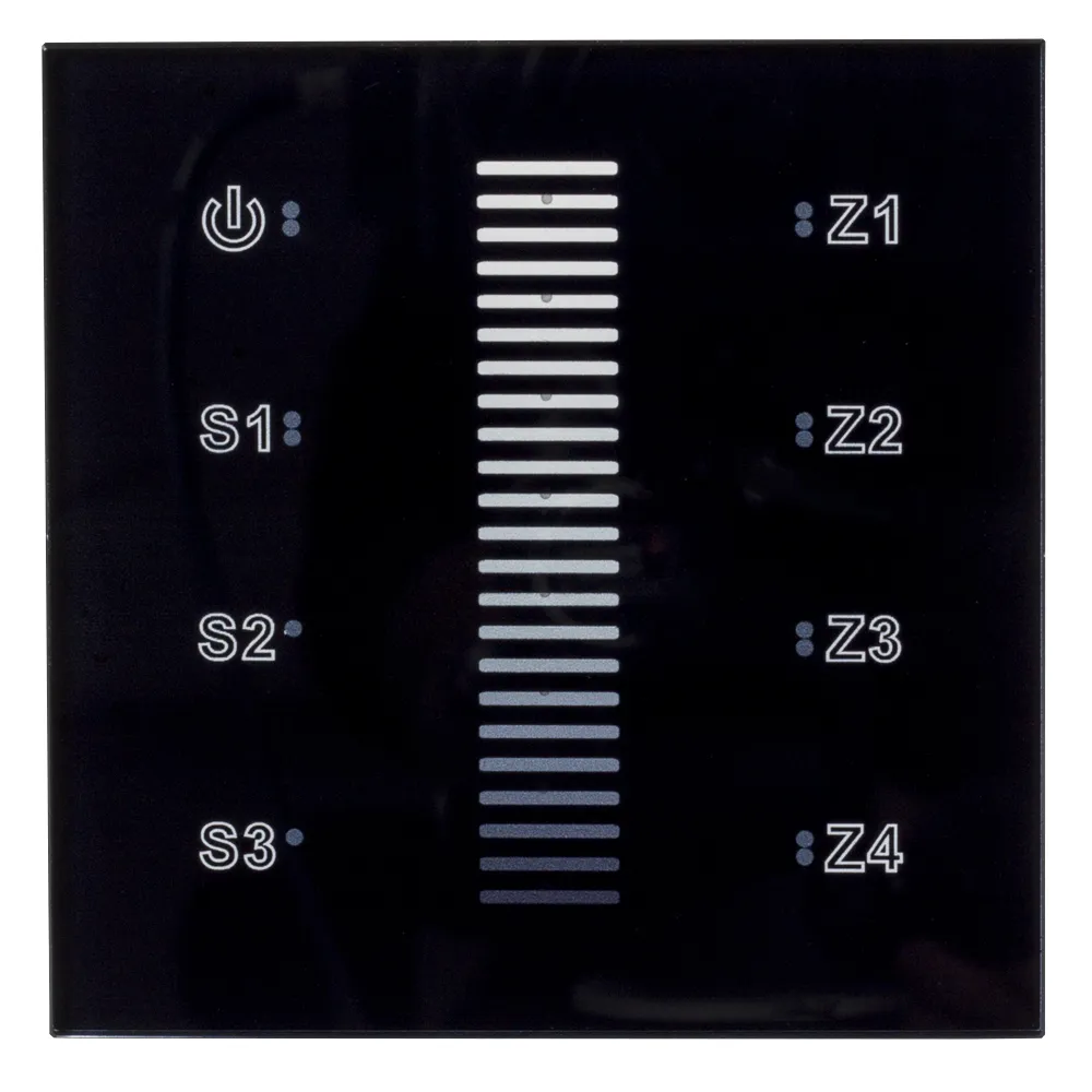 Встраиваемая сенсорная панель с выходом DALI. Управление 4-мя зонами. Каждая зона = 1 адрес DALI. Адреса расположены последовательно (например, 01, 02, 03, 04). Установка адресов управления выполняется переключателями на корпусе. Питание DC 12-24В. Индикация состояния светодиодами на панели. Сохранение 3-х пользовательских настроек.