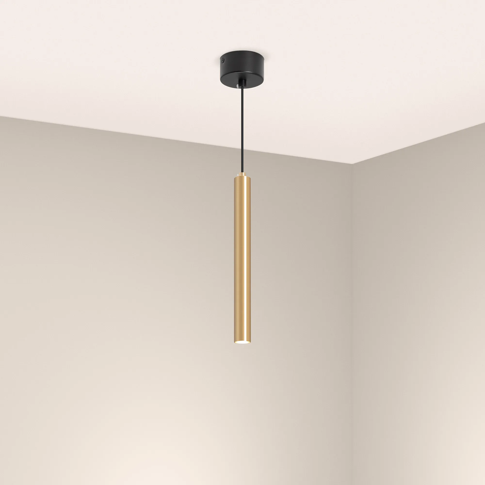 Подвесной светильник. Мощность 9 Вт, св. поток 561 лм, 64 лм/Вт, дневной 4000 K, CRI>90, угол 24°, напряжение питания 230 В. Золотой круглый корпус из алюминия, рассеиватель PC, степень защиты IP20. Размер: диаметр 30 мм, длина 300 мм, размер чаши: диаметр 80 мм, высота 40 мм. Монтаж подвесной, длина подвеса 1500 мм. Драйвер 28-42 В, 200 мА, пульсация <1%.