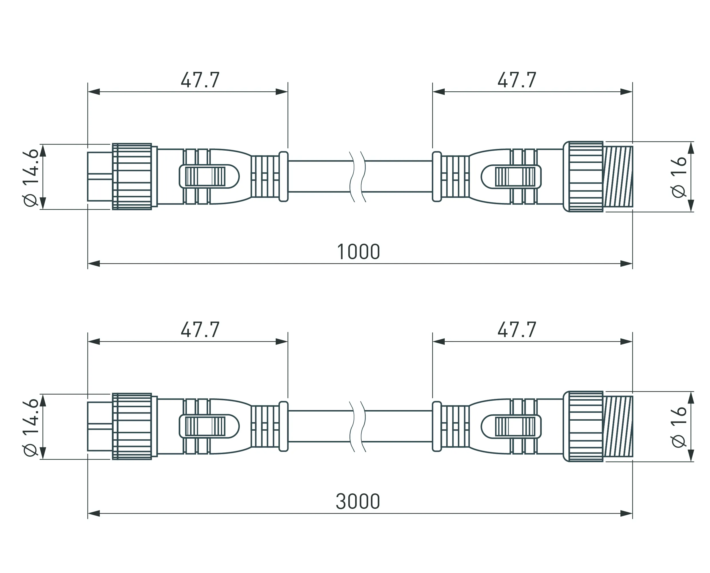 Водонепроницаемый IP67 прямой коннектор для электрического соединения светильников серии LINE. Длина 3000мм, сечение 3x1.0мм2 Один конец - male коннектор 3 pins, другой конец- female коннектор 3 pins. Габариты разъёмов DxH - Ø18х48мм.