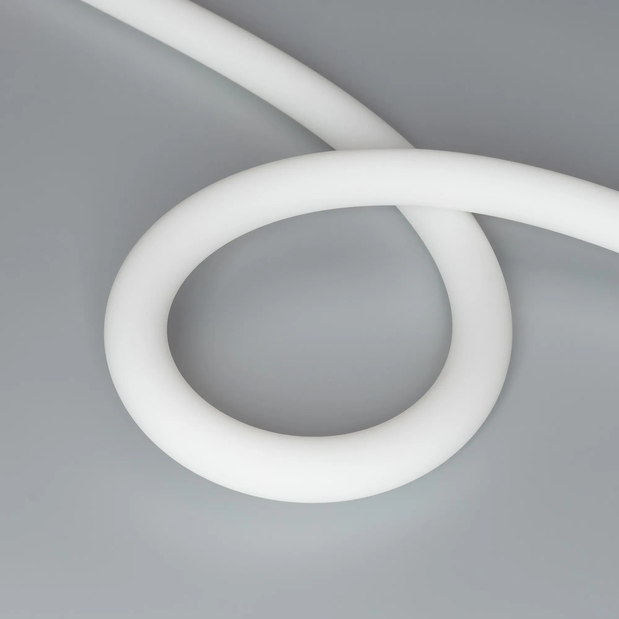 Гибкая герметичная лента (неон серии MOONLIGHT), сечение 25×25 мм. Светодиоды SMD 2835 336 шт/м. Цвет свечения ТЕПЛЫЙ БЕЛЫЙ (2700 К), индекс цветопередачи CRI>90, световой поток 950 лм/м, угол излучения 360°. Мощность 14.4 Вт/м, питание 24 В. Класс пылевлагозащиты IP65. Размеры 5000×25×25 мм. Произвольная резка. Изгиб согласно метки на корпусе, минимальный радиус изгиба 150 мм. Кабель питания длиной 500 мм, вывод с одной стороны вбок линии сечения неона. Катушка 5 м. Цена за 1 м. Гарантия 3 года.