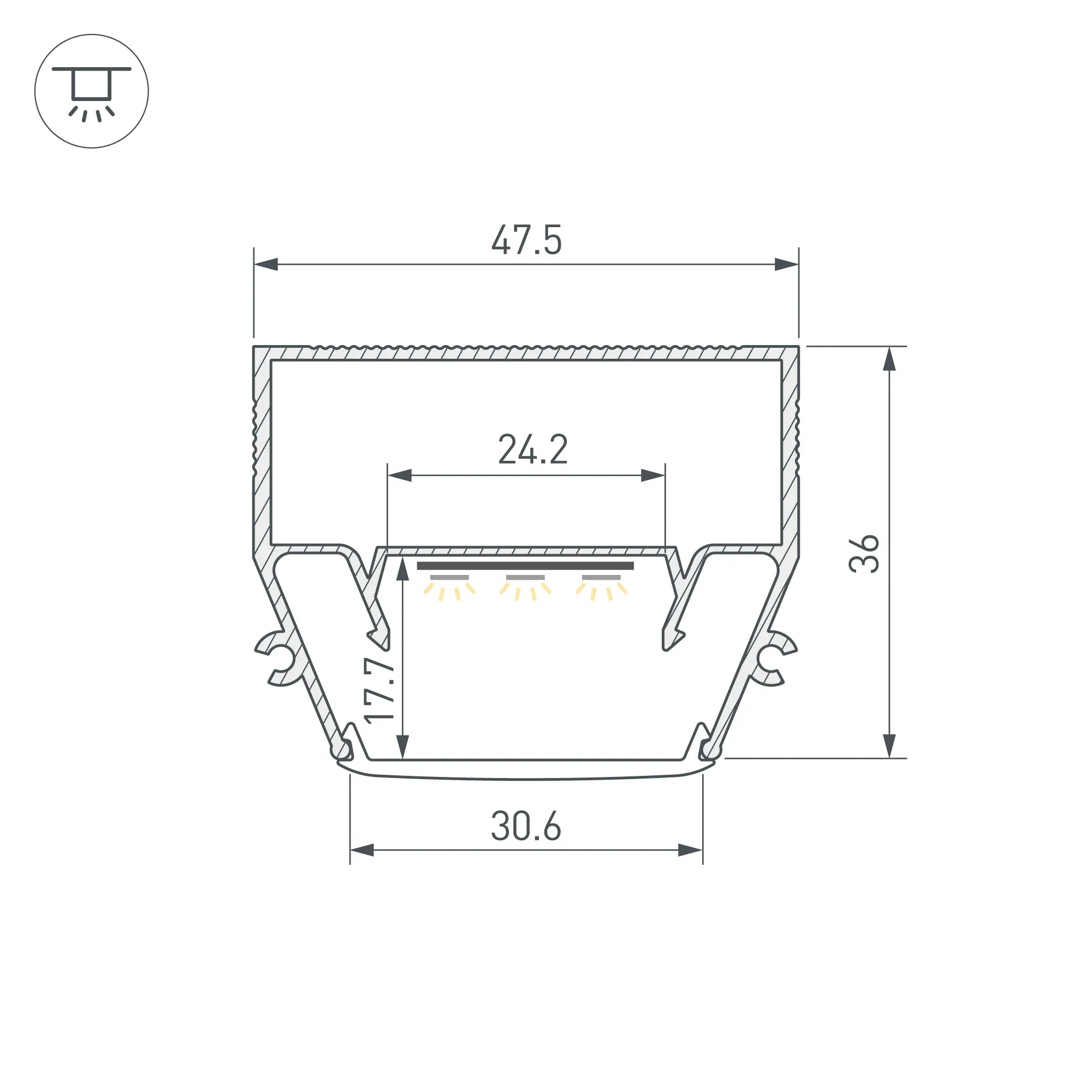 Алюминиевый профиль для натяжных потолков (центральная линия). Решение 2-в-1 - каркас для крепления натяжного потолка и профиль для установки светодиодной ленты. Для дизайнерских решений «линии света» в натяжных потолках. Монтируется к потолку накладным способом. Ширина площадки для ленты 24,2 мм. Длина 2000 мм. Цена за 1 м.