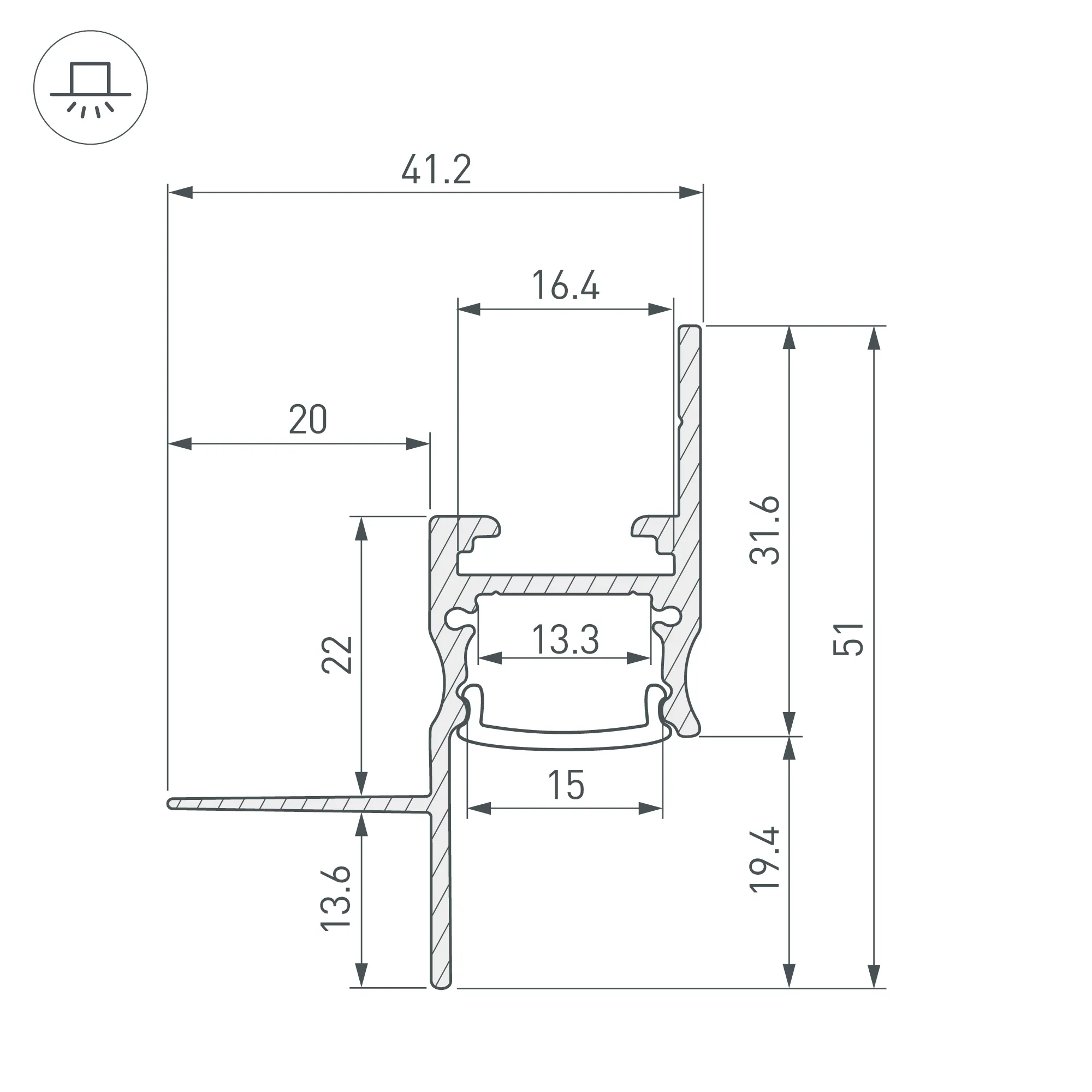 Алюминиевый встраиваемый профиль для светодиодных лент и линеек. Цвет-белый RAL9003 (порошковая окраска). Габаритные размеры (L×W×H): 2000х41,2х51 мм. Ширина площадки для ленты 13,3 мм. Экраны, заглушки и другие аксессуары приобретаются отдельно. Цена за 1 метр.