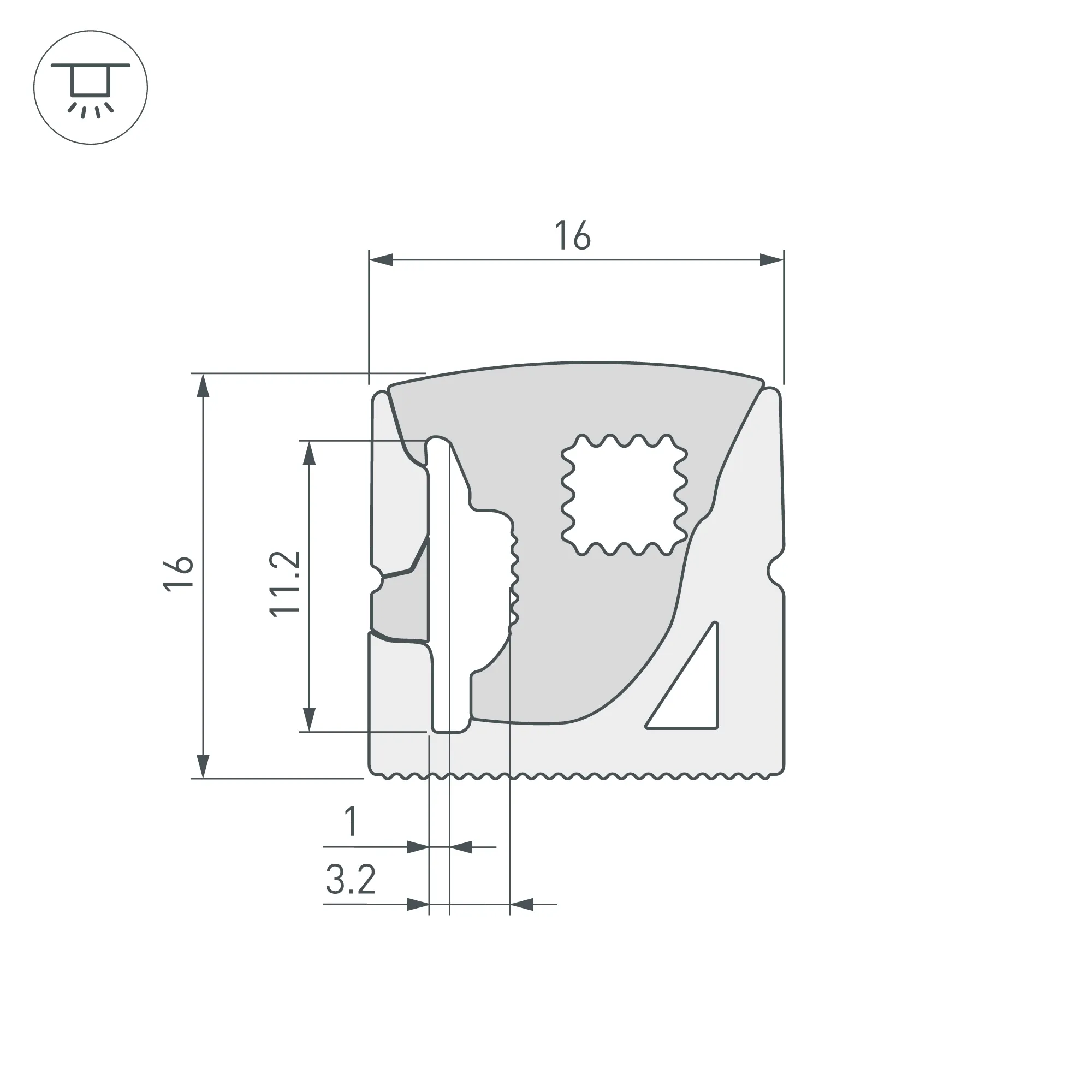 Цельнолитой силиконовый гибкий профиль, белый матовый. Габаритные размеры 20000×16×16 мм Гнется в плоскости. Для установки во влажных помещениях необходима герметизация при помощи двухкомпонентного эпоксидного герметика. Класс пылевлагозащиты – IP65 (при соблюдении технологии герметизации). Для лент шириной от 8 до11 мм, высотой до 3,3 мм и мощностью до 10 Вт/м. Угол излучения 110°. Поставляется в катушках по 20 м. Цена за 1 м.