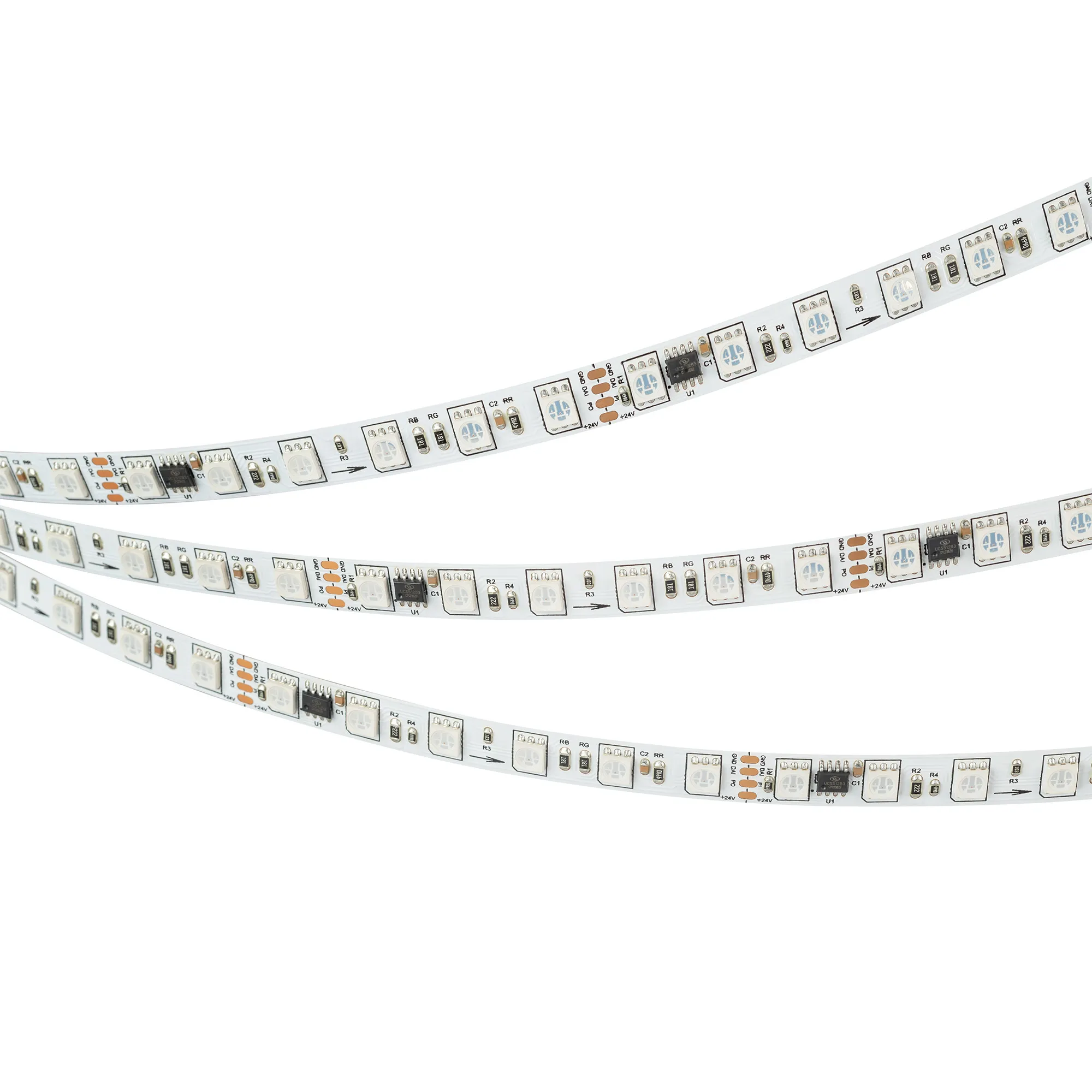 Светодиодная лента DMX серии B72 с микросхемой UCS512. Светодиоды SMD 5060, 72шт/м, 12 pixels на 1 м (60 pixels на 5 м), 1 pixel = 6 светодиодов, белая плата шириной 10 мм, скотч 3М. Цвет RGB, угол 120°. Питание 24 В, мощность 16 Вт/м (80 Вт на 5 м). Размеры 5000x10x2 мм. Мин.отрезок 83.33 мм, 6 светодиодов. Цена за 1м.