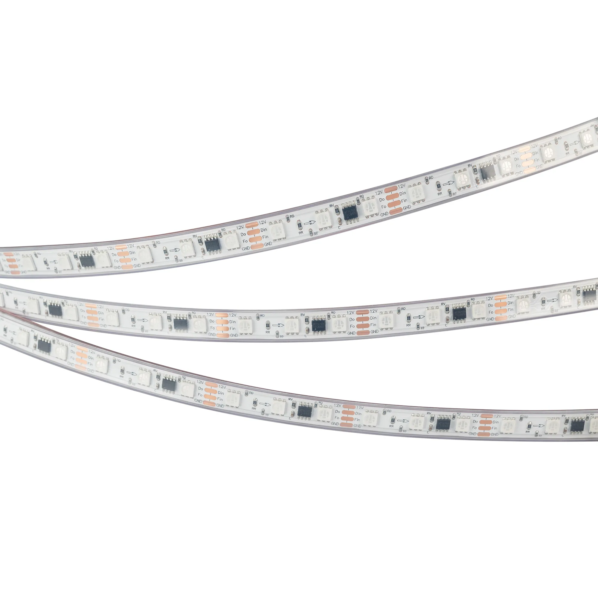 Светодиодная герметичная лента SPI серии B60 с микросхемой MT1808A, IP67 (PS - силиконовая экструзия). Светодиоды SMD 5060, 60 шт/м, 20 pixels на 1м (100 pixels на 5 м), 1 pixel = 3 светодиода, белая плата шириной 10 мм, скотч 3М. Цвет RGB, угол 120°. Питание 12 В, мощность 12 Вт/м (60 Вт на 5 м). Размеры 5000x12x5 мм. Мин. отрезок 50 мм, 3 светодиода. Цена за 1 м.