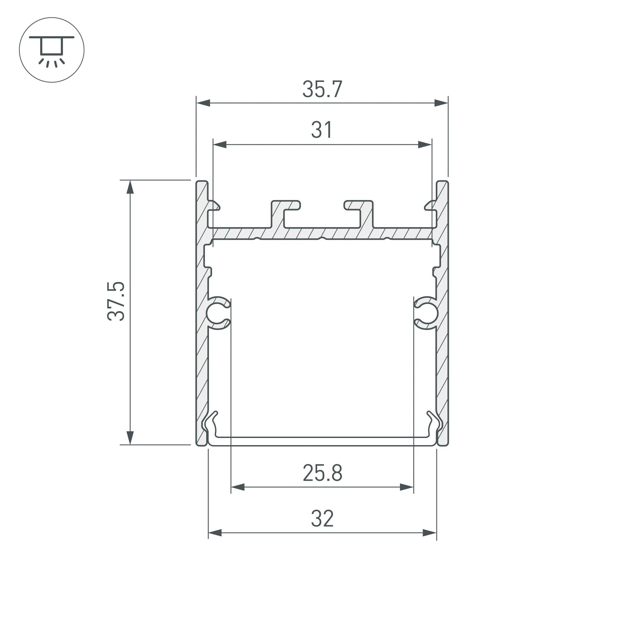 Алюминиевый профиль для светодиодных лент и линеек. Цвет - белый (порошковая окраска RAL9003). Габаритные размеры (L×W×H): 3000x36x38 мм. Ширина площадки для ленты 31 мм. Экраны, заглушки и другие аксессуары приобретаются отдельно. Цена за 1 метр.