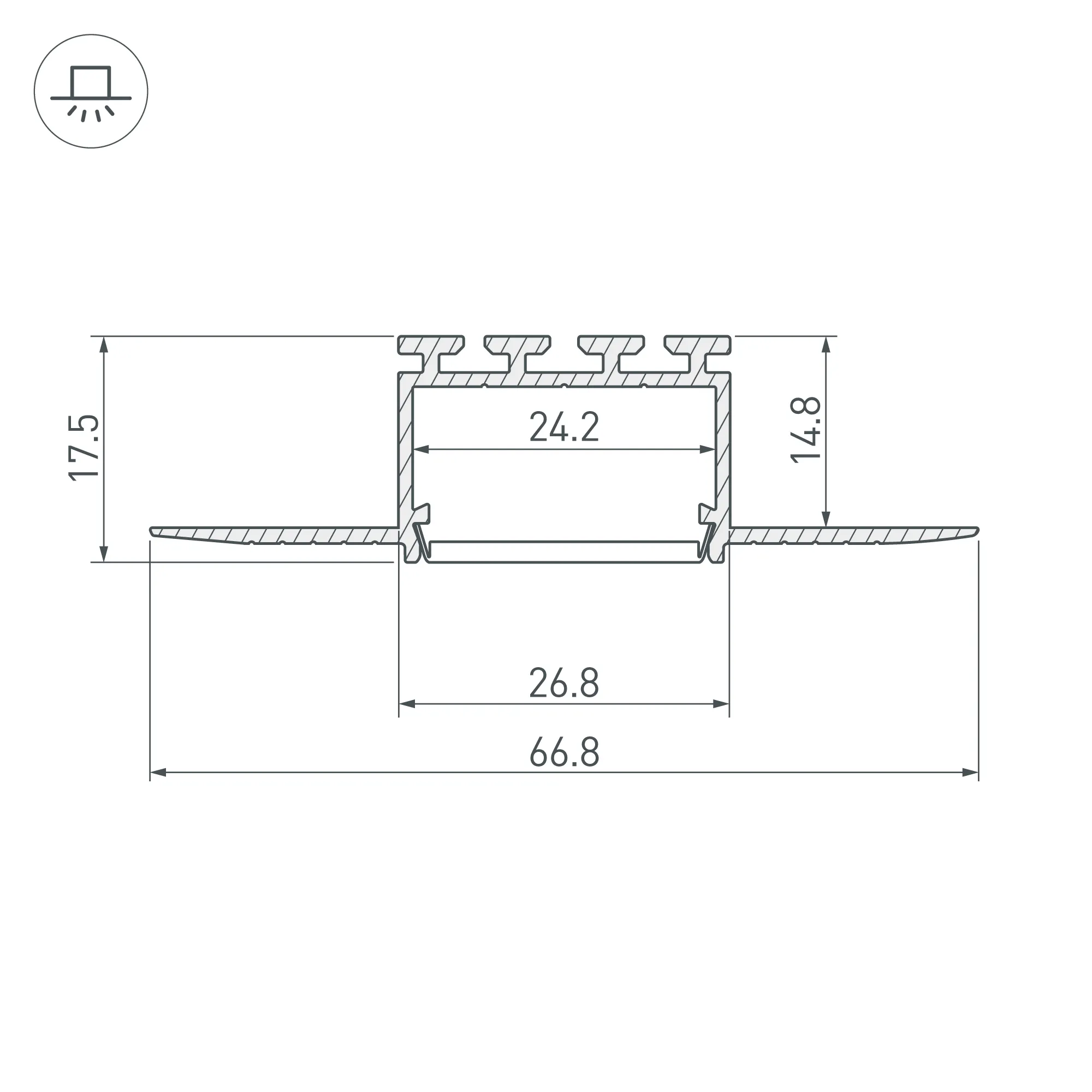 Алюминиевый профиль для светодиодных лент и линеек. Встраиваемый в гипсокартон толщиной 16 мм, под строительную отделку. Позволяет создать линию света шириной 24 мм. без видимых частей алюминия. Габаритные размеры (L×W×H): 3000x66,8x17,5 мм. Ширина площадки для ленты 24,2 мм. Экраны, заглушки и другие аксессуары приобретаются отдельно. Цена за 1 метр.