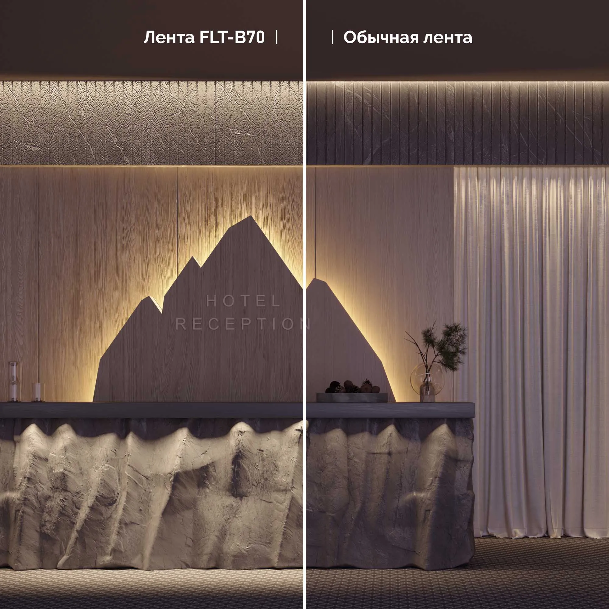 Светодиодная лента FLT серии B70 с направленной линзой 45°. Светодиоды SMD 5060, 70 шт/м. Белая плата шириной 8 мм, скотч 3M. Цвет ТЕПЛЫЙ 2700K, индекс цветопередачи CRI>90. Питание 24 В, мощность 15.5 Вт/м (77.5 на 5 м). Размеры 5000x8x6 мм. Мин. отрезок 100 мм, 7 светодиодов. Цена за 1 м