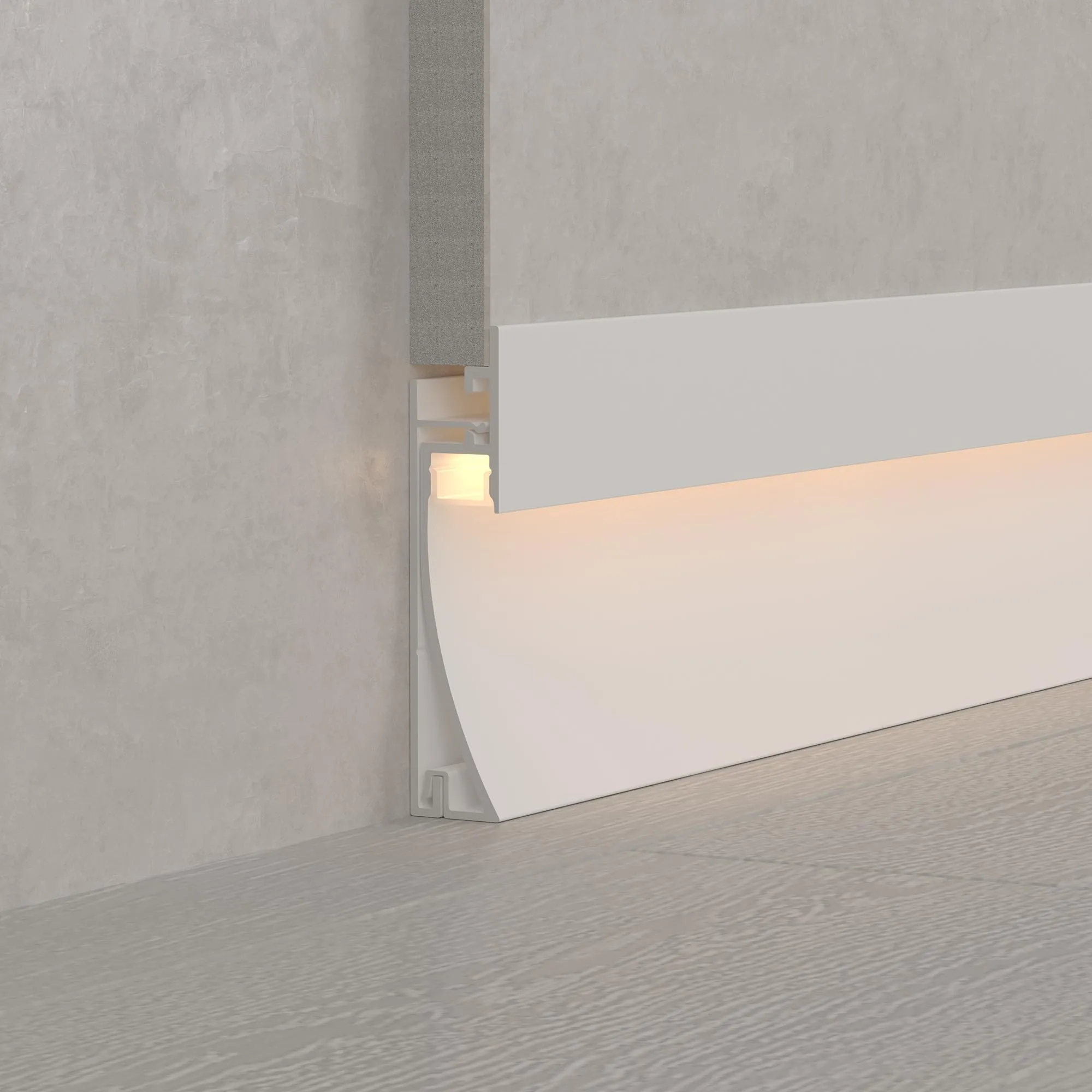 Алюминиевый встраиваемый двухкомпонентный профиль-плинтус для светодиодных лент и линеек. Цвет - белый RAL9003 (порошковая окраска). Габаритные размеры (L×W×H): 2000x12,28x58,20 мм. Ширина площадки для ленты 8 мм. Аксессуары приобретаются отдельно. Цена за метр.