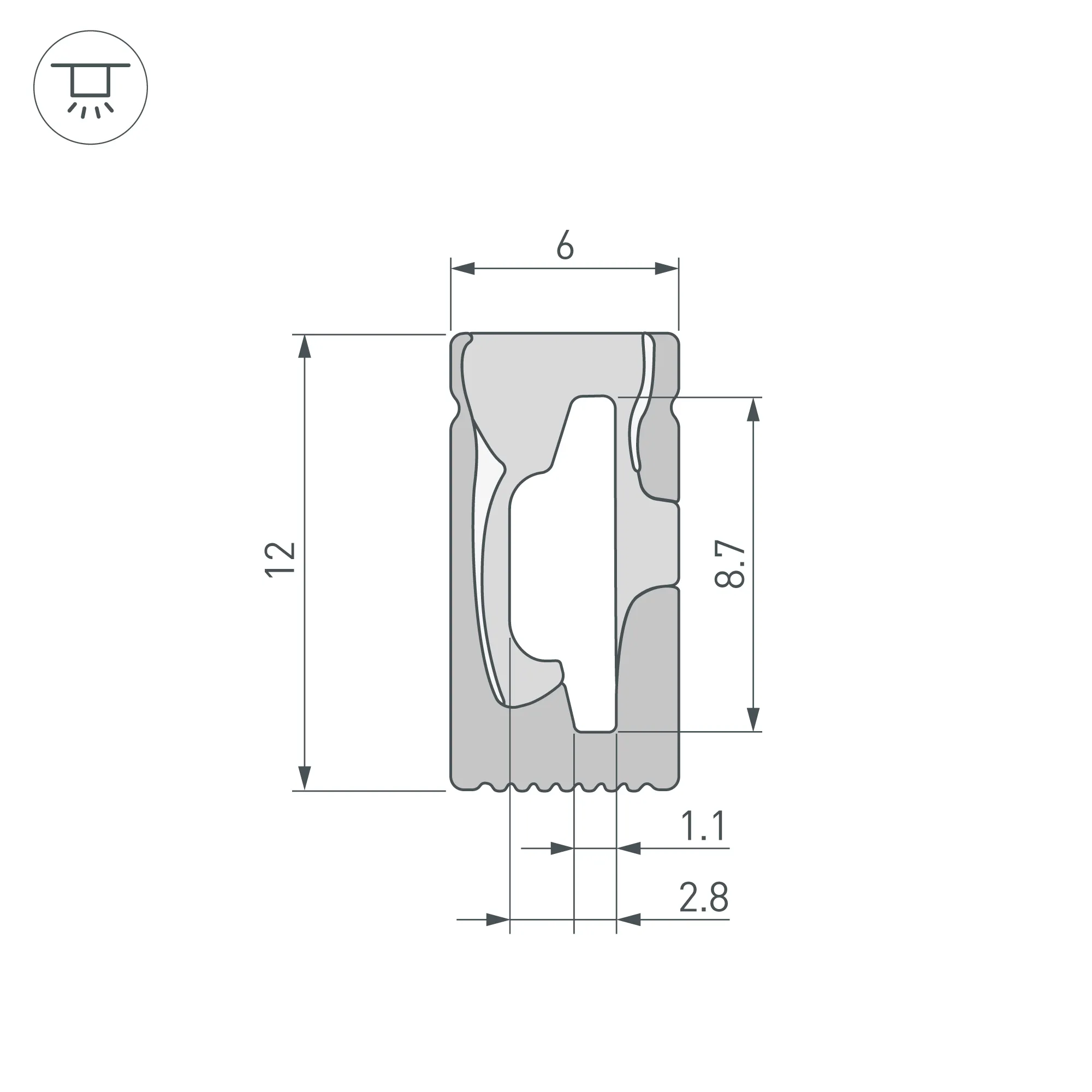 Цельнолитой силиконовый гибкий профиль, боковая часть - белая матовая, остальные стороны - черные матовые. Габаритные размеры 10000×6×12 мм. Гнется в плоскости. Для установки во влажных помещениях необходима герметизация при помощи двухкомпонентного эпоксидного герметика. Класс пылевлагозащиты – IP65 (при соблюдении технологии герметизации). Для лент шириной от 6 до 8 мм, высотой до 2,9 мм и мощностью до 10 Вт/м. При подборе ленты необходимо учитывать, что втяжка лент COB, герметичных лент и лент с наличием силиконового слоя может быть затруднена. Поставляется в катушках по 10 м. Цена за 1 м.