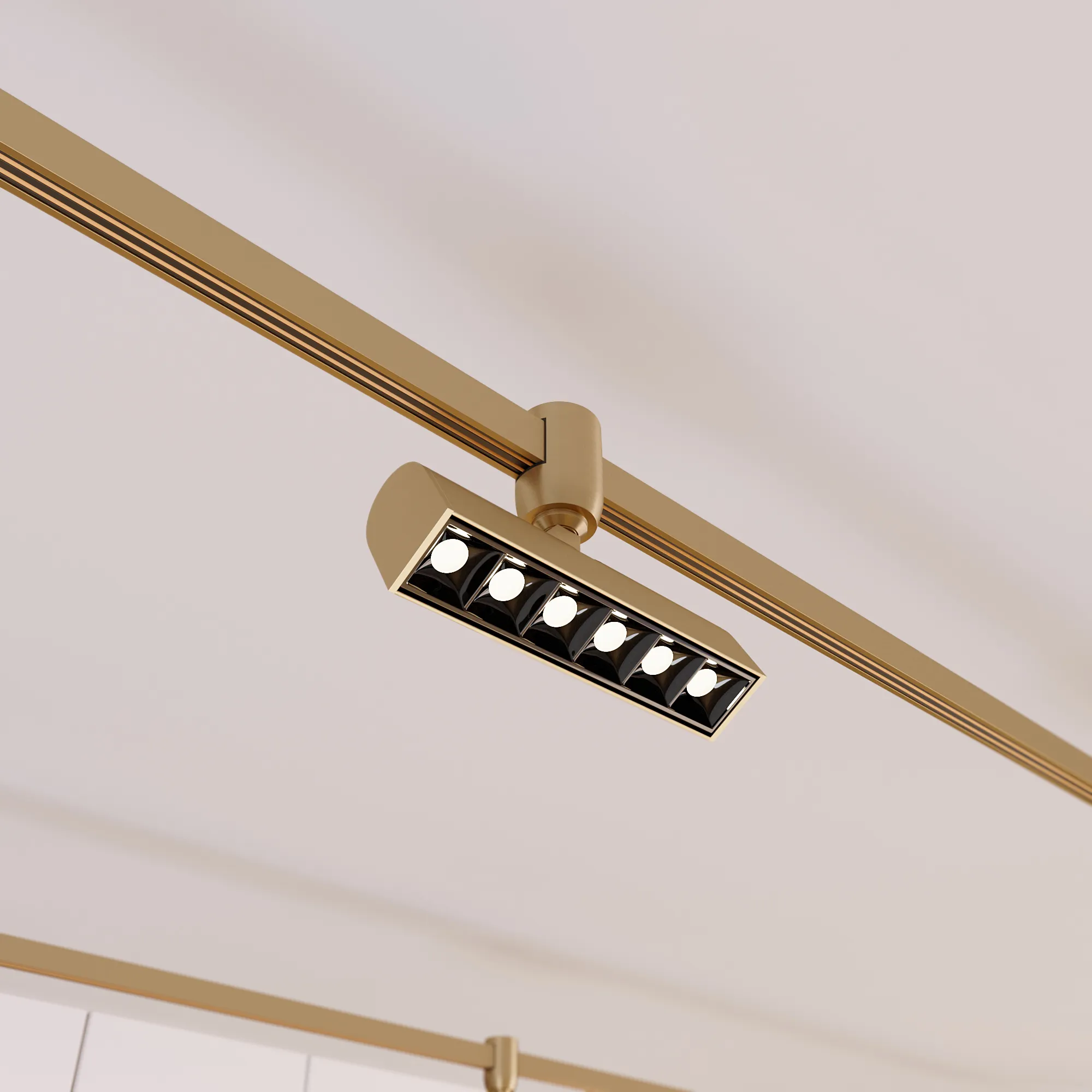 Светильник поворотный для треков APRIORI шириной 17 мм. Мощность 8 Вт, св. поток 395 лм, 49 лм/Вт, дневной 4000 K, CRI>90, угол 48°, напряжение питания 48 В. Линейный корпус из алюминия, гальванизированного в цвет светлое золото, степень защиты IP20. Размер: длина 165,5 мм, ширина 38 мм, высота 125 мм. Монтаж на трек APRIORI 17 мм. Пульсация <1%. Возможно диммирование по ШИМ (PWM) или не адресное управление при использовании диммируемого драйвера Dali, 0-10V, TRIAC.