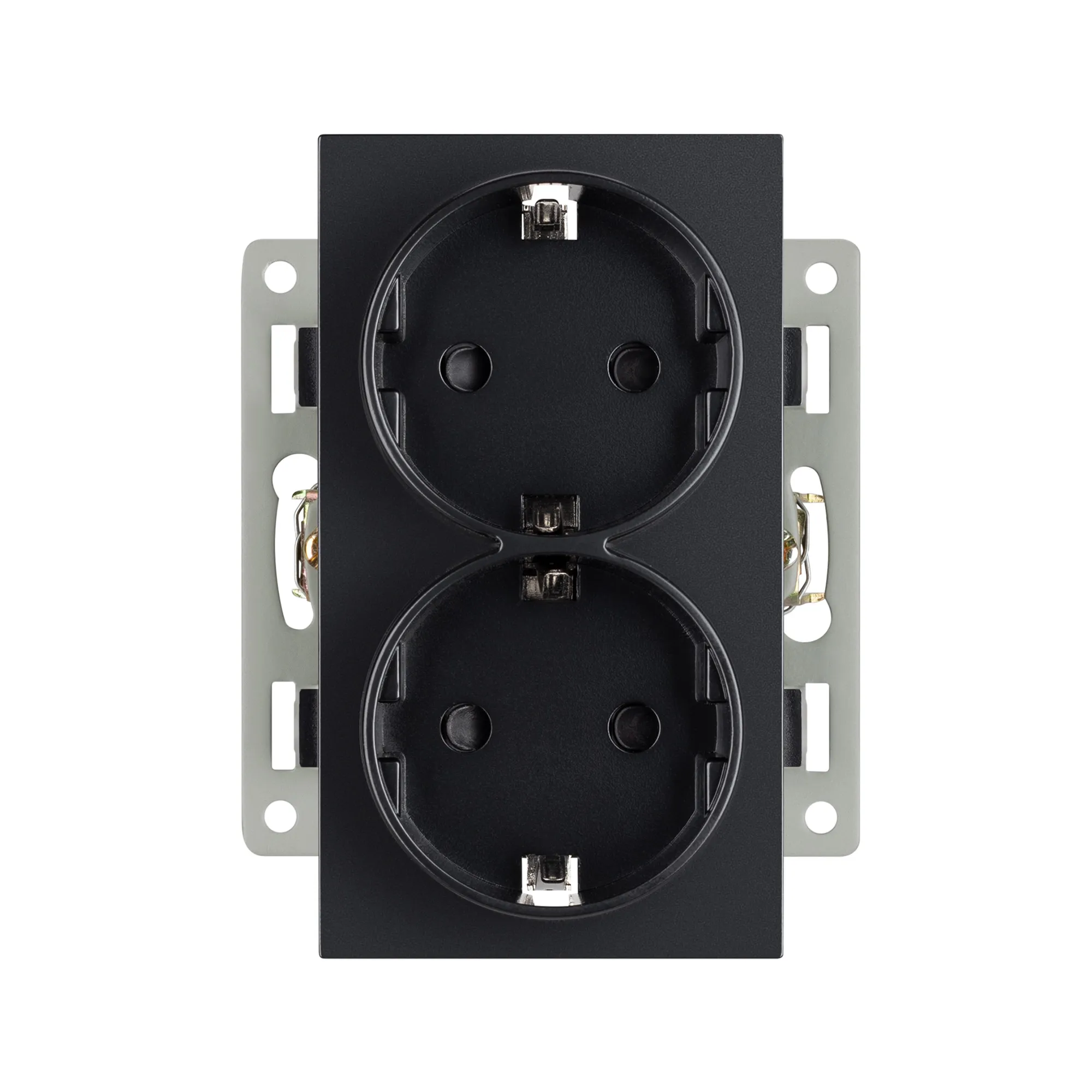 Механизм розетки вертикальный, с заземлением на 2 поста и с суппортом из алюминия. Цвет - черный. Степень пылевлагозащиты - IP20.