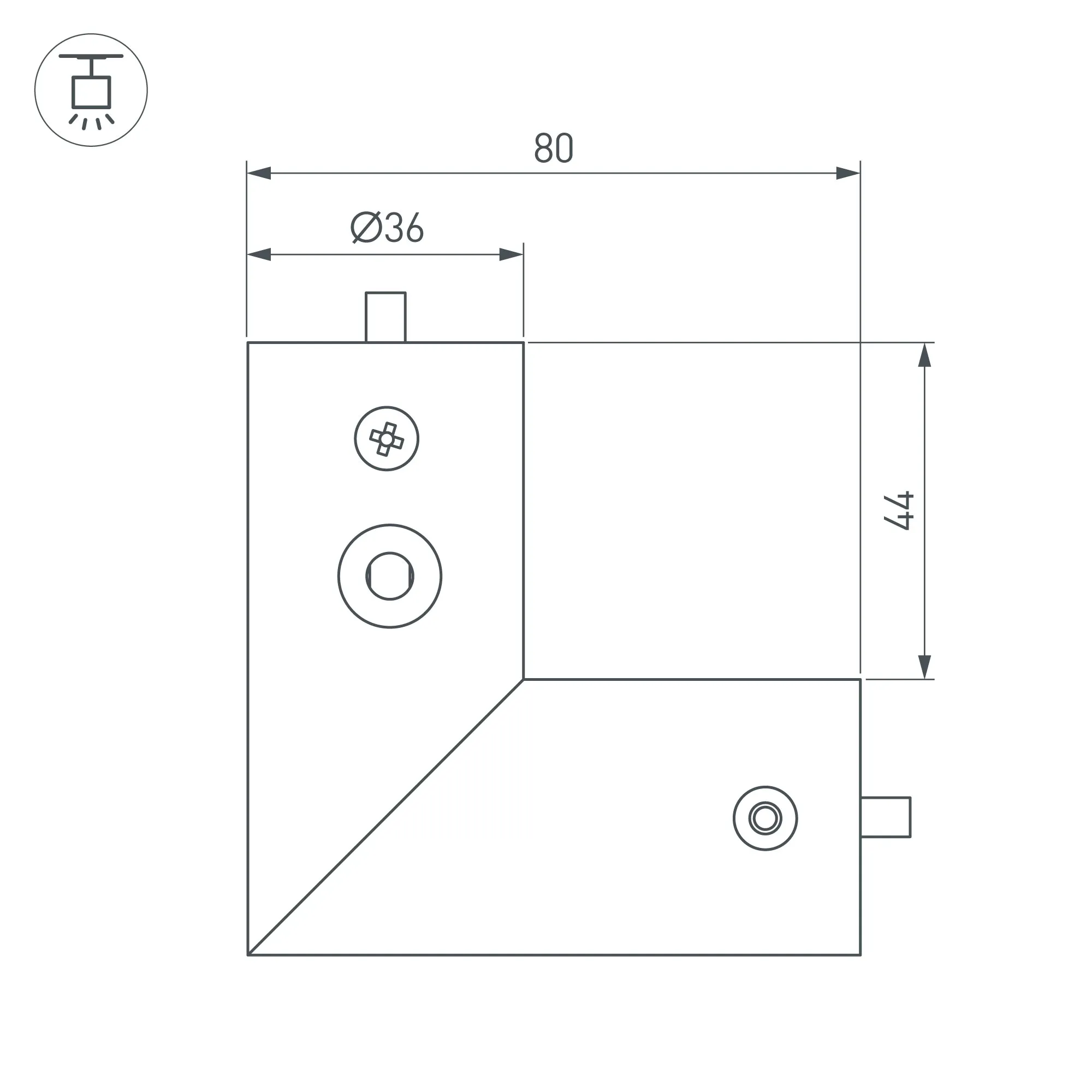Угловой коннектор для соединения двух отрезков профиля ROUND-D36-360 под углом 90° с отверстием для вывода кабеля питания. В комплекте: соединитель угловой - 1 шт., втулка - 2 шт., винт длинный - 2 шт., винт короткий - 6 шт., гермоввод - 1 шт. Цена за комплект.