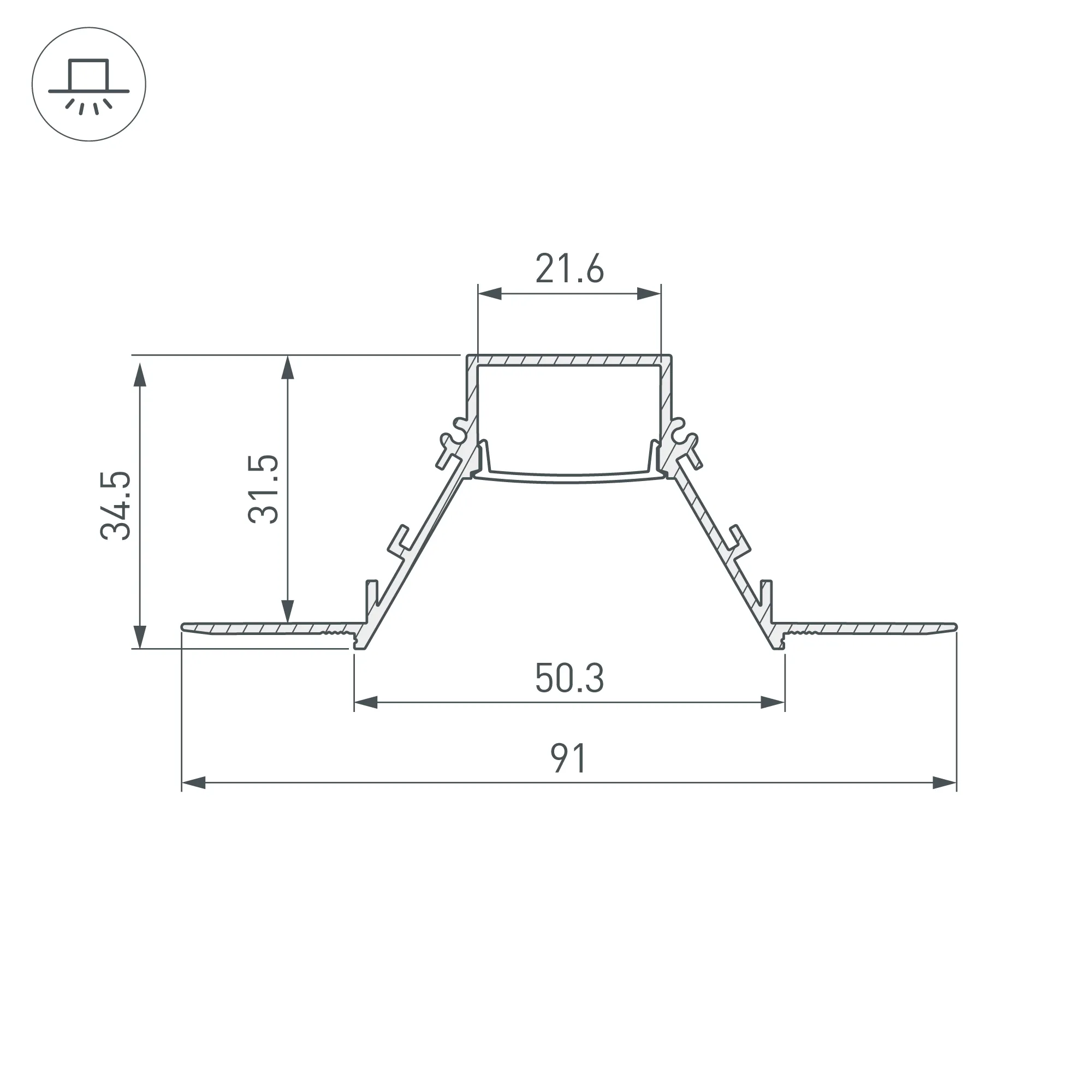 Алюминиевый анодированный профиль для светодиодных лент и линеек. Скрытая установка (под строительную отделку). Экран утоплен в плоскости профиля, что позволяет скрыть источник света от прямого контакта с глазами. Габаритные размеры (L×W×H): 2000x91x34,5 мм. Ширина площадки для ленты 21,6 мм. Экраны, заглушки и другие аксессуары приобретаются отдельно. Цена за 1 метр.