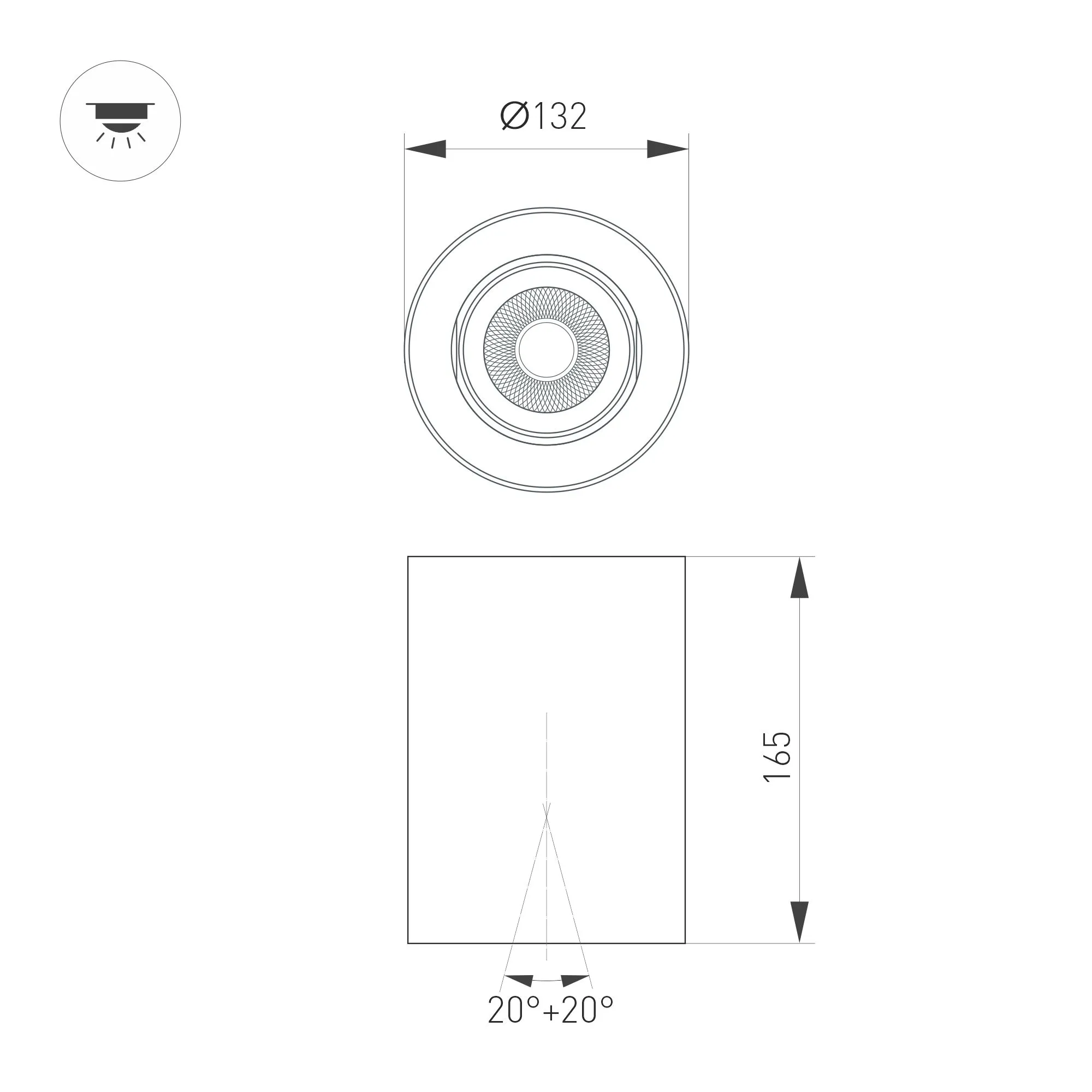 Накладной интерьерный светильник. Мощность 24 Вт, св. поток 2400 лм, 99 лм/Вт, дневной 4000 K, CRI>90, угол 15°, регулируемое направление луча 40°(20+20), поворотный световой модуль вокруг своей оси на 340°, UGR <11, напряжение питания 230 В. Белый круглый корпус из алюминия, степень защиты IP54. Размер: диаметр 132 мм, высота 165 мм. Монтаж накладной. Драйвер 27-45 В, 600мА, пульсация <1%.