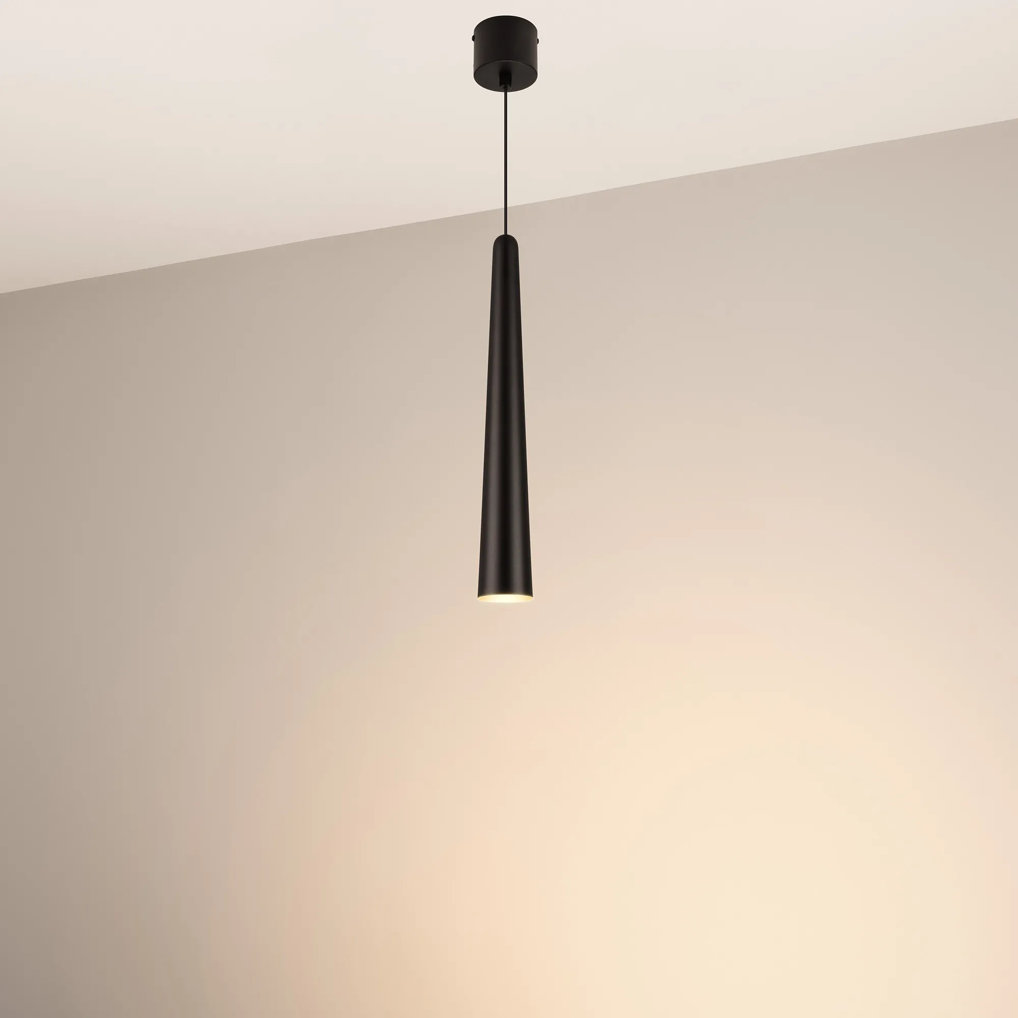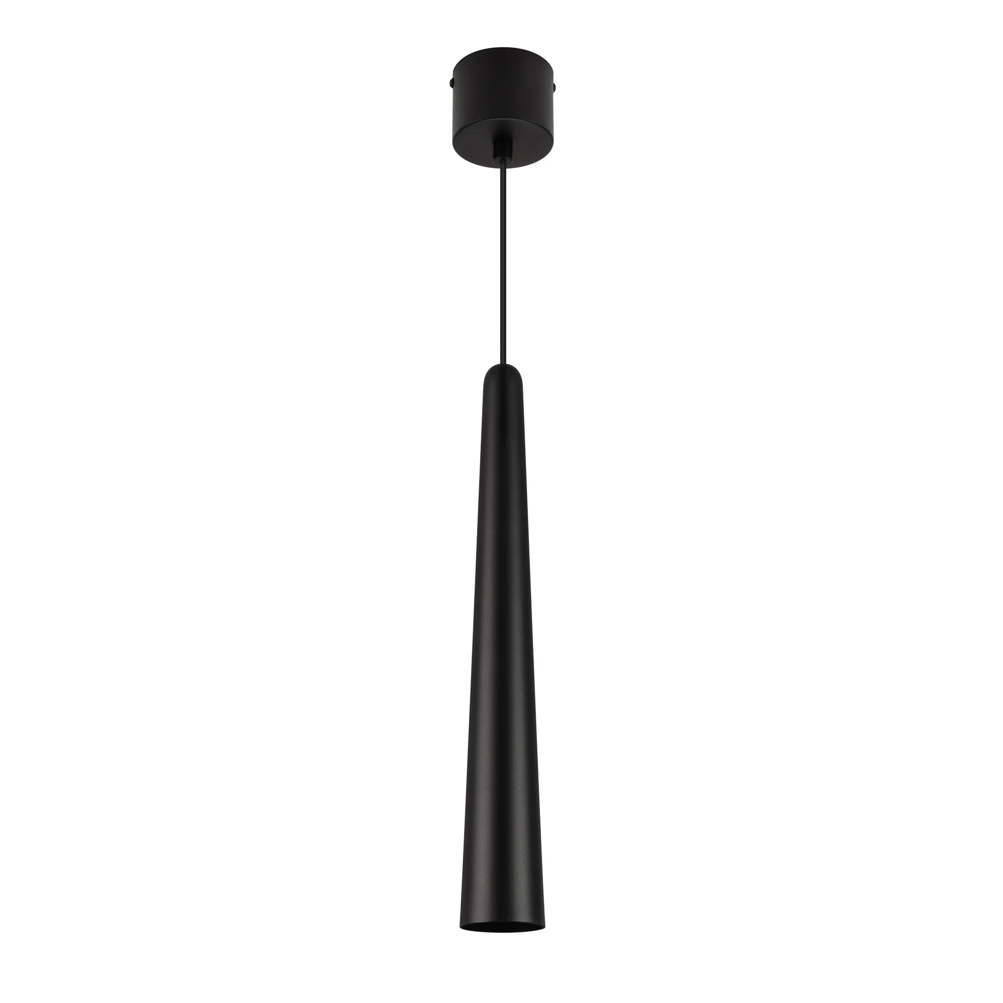 Подвесной светильник. Мощность 5 Вт, св. поток 400 лм, световая эффективность 70 лм/Вт, теплый 3000K, CRI>92, угол 36°, напряжение питания 230 В. Чёрный конусообразный вытянутый корпус из алюминия, линза из PMMA, степень защиты IP20. Размер: диаметр 57 мм, высота 400 мм. Монтаж подвесной, длина подвеса 2000 мм, регулируемая. В комплекте 2 вида чаш. Габариты встраиваемой чаши: Ø 80x41 мм. Габариты накладной чаши Ø80x60 мм. Драйвер 2,8-12В, 500 мА, пульсация <1%.