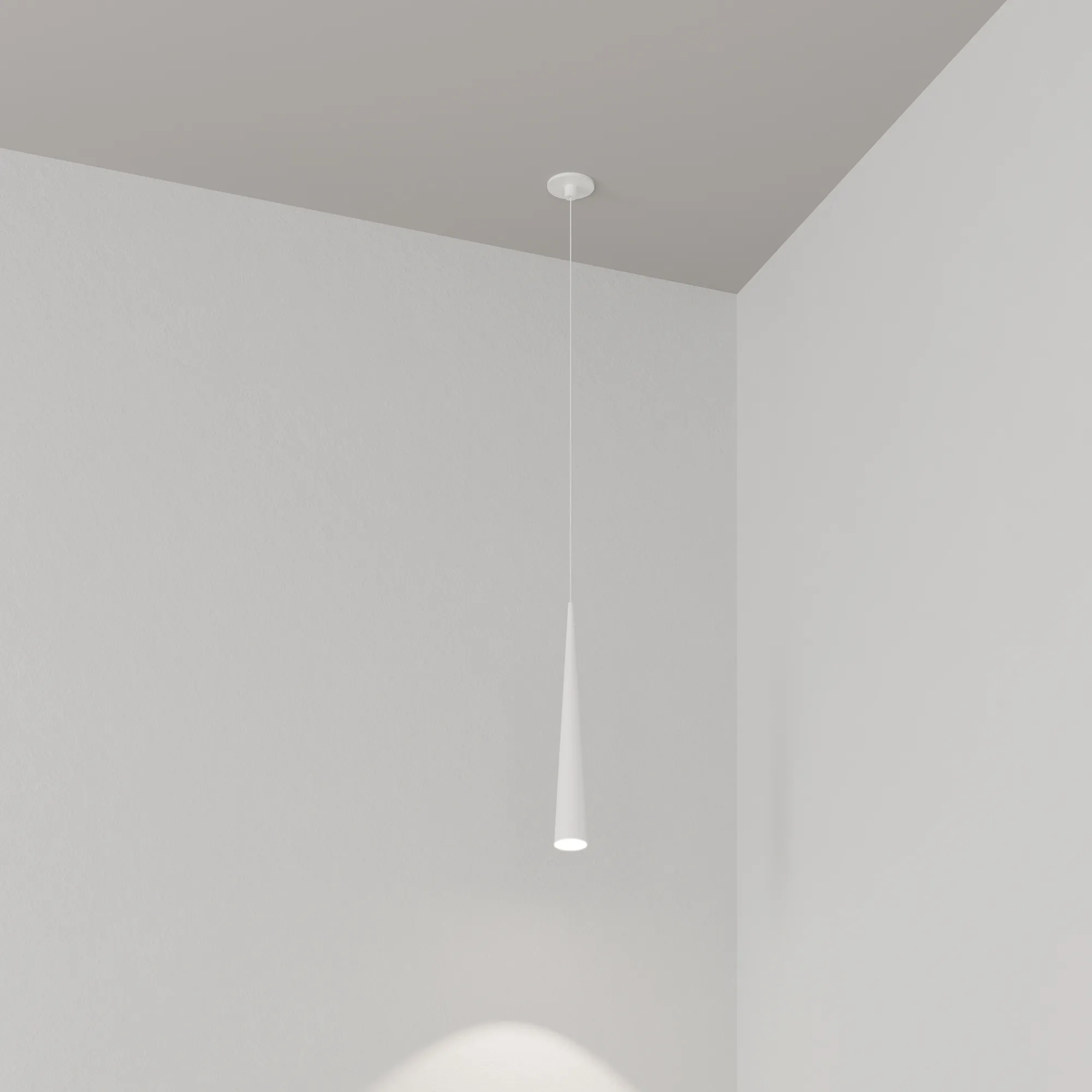 Подвесной светильник. Мощность 5 Вт, св. поток 400 лм, световая эффективность 70 лм/Вт, теплый 3000K, CRI>92, угол 36°, напряжение питания 230 В. Белый конусообразный вытянутый корпус из алюминия, линза из PMMA, степень защиты IP20. Размер: диаметр 57 мм, высота 400 мм. Монтаж подвесной, длина подвеса 2000 мм, регулируемая. В комплекте 2 вида чаш. Габариты встраиваемой чаши: Ø 80x41 мм. Габариты накладной чаши Ø80x60 мм. Драйвер 2,8-12В, 500 мА, пульсация <1%.